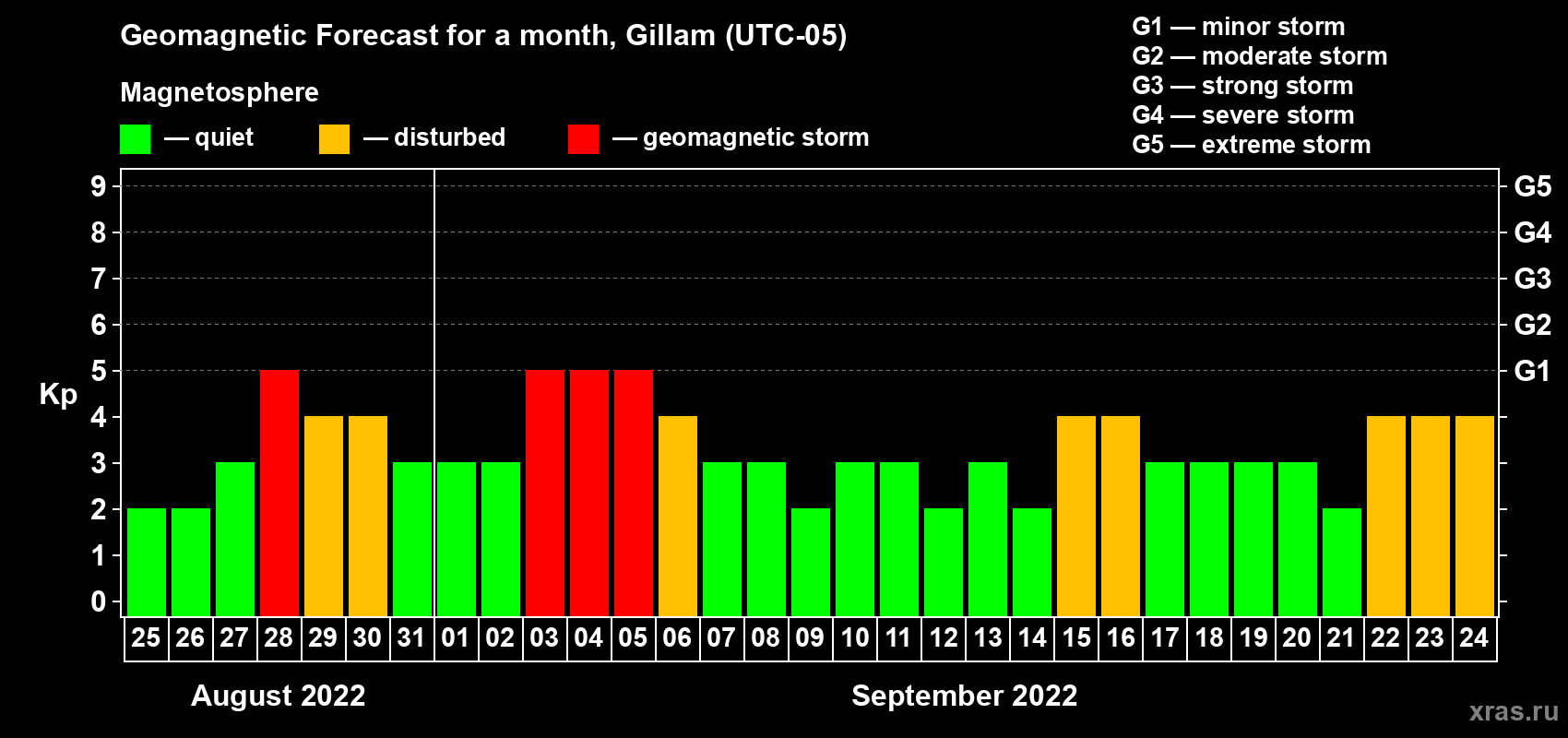 Geomagnetic storm forecast in Gillam for Aug 25, 2022