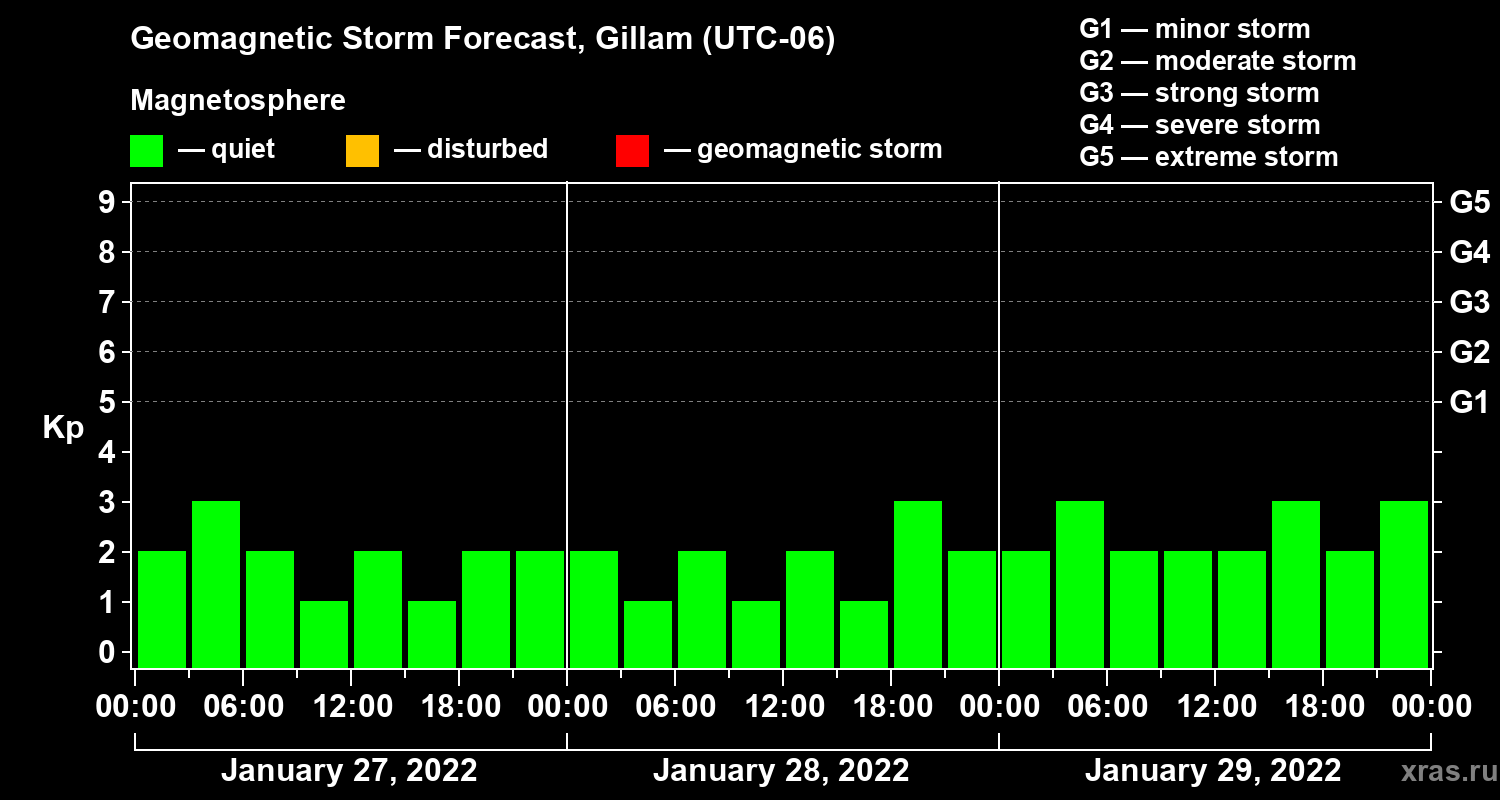 Geomagnetic storm forecast in Gillam for Jan 27, 2022