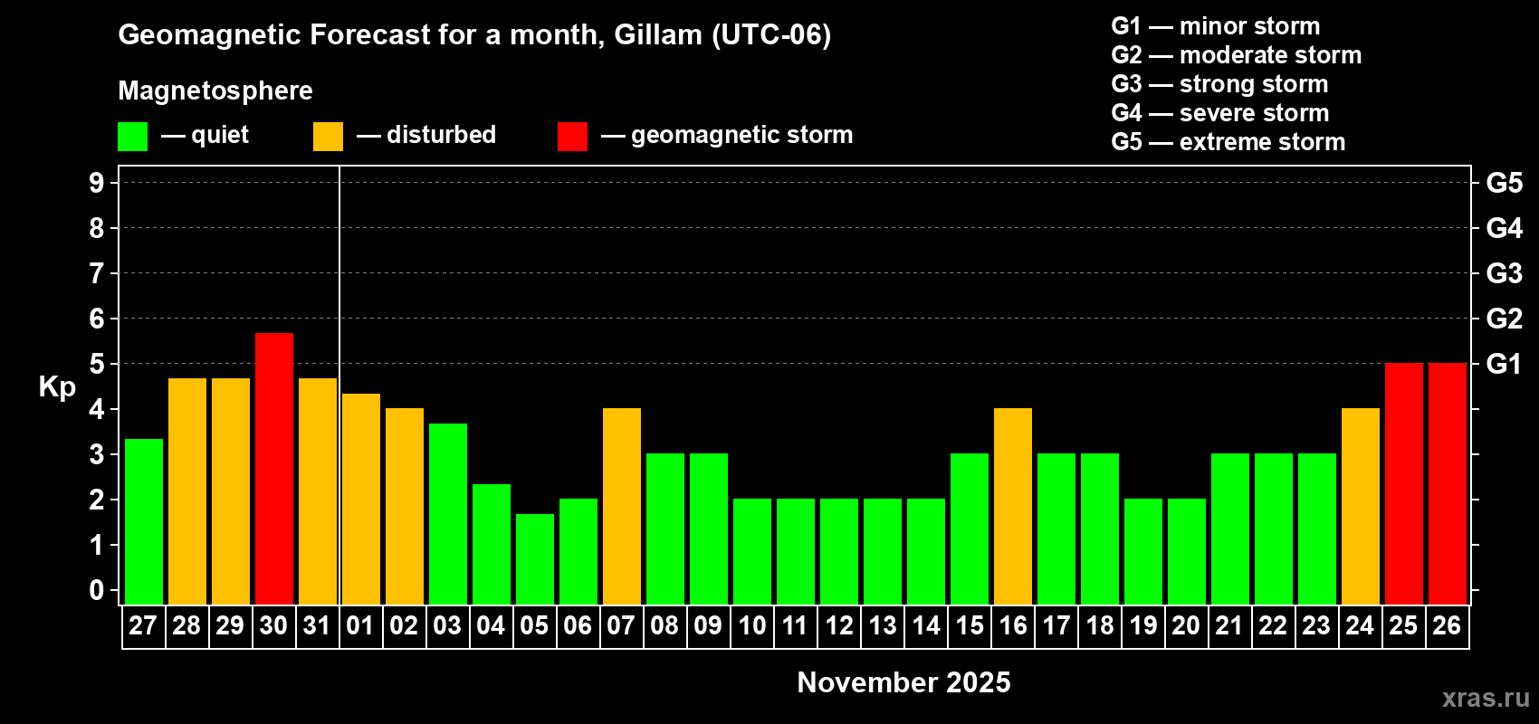 Geomagnetic storm forecast in Gillam for Oct 27, 2025