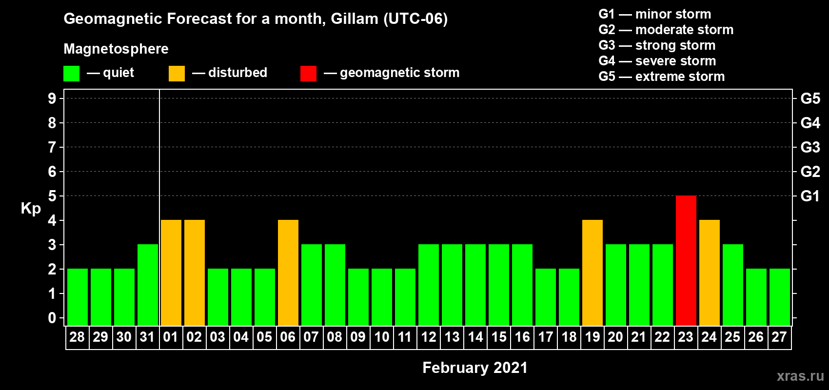 Geomagnetic storm forecast in Gillam for Jan 28, 2021
