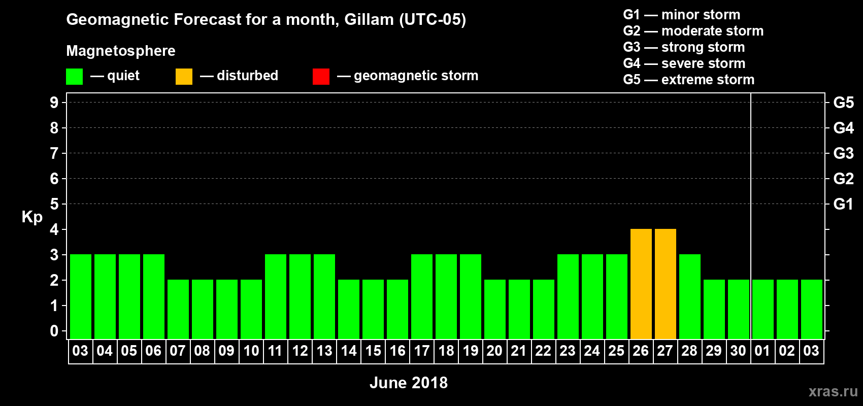Geomagnetic storm forecast in Gillam for Jun 03, 2018