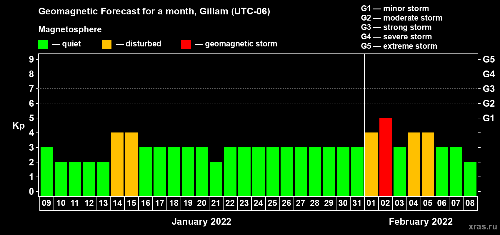 Geomagnetic storm forecast in Gillam for Jan 09, 2022