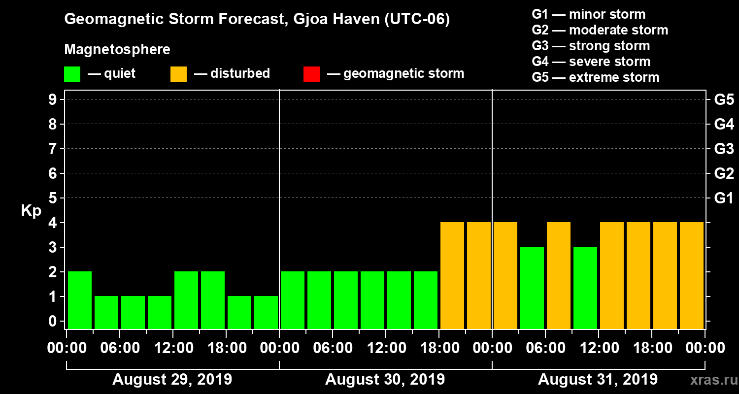 Geomagnetic storm forecast in Gjoa Haven for Aug 29, 2019