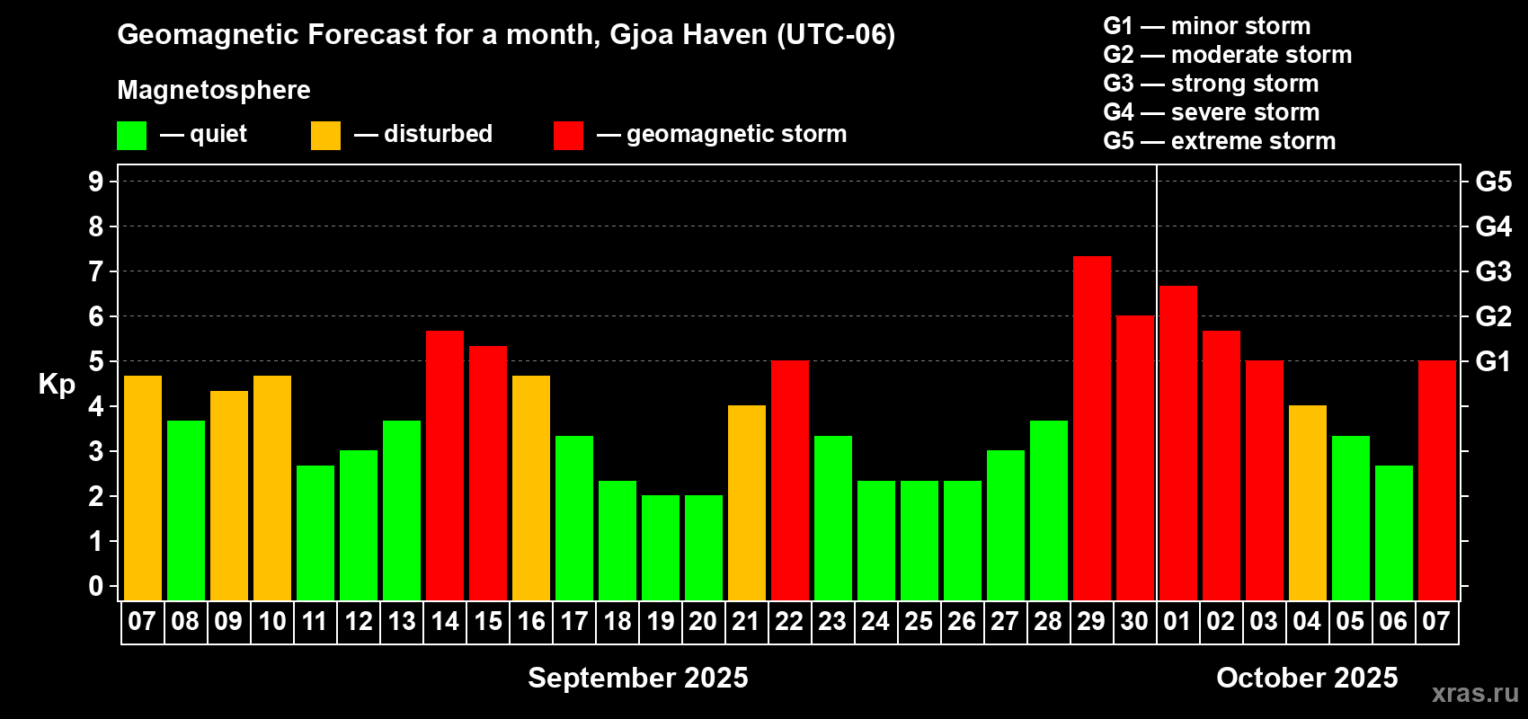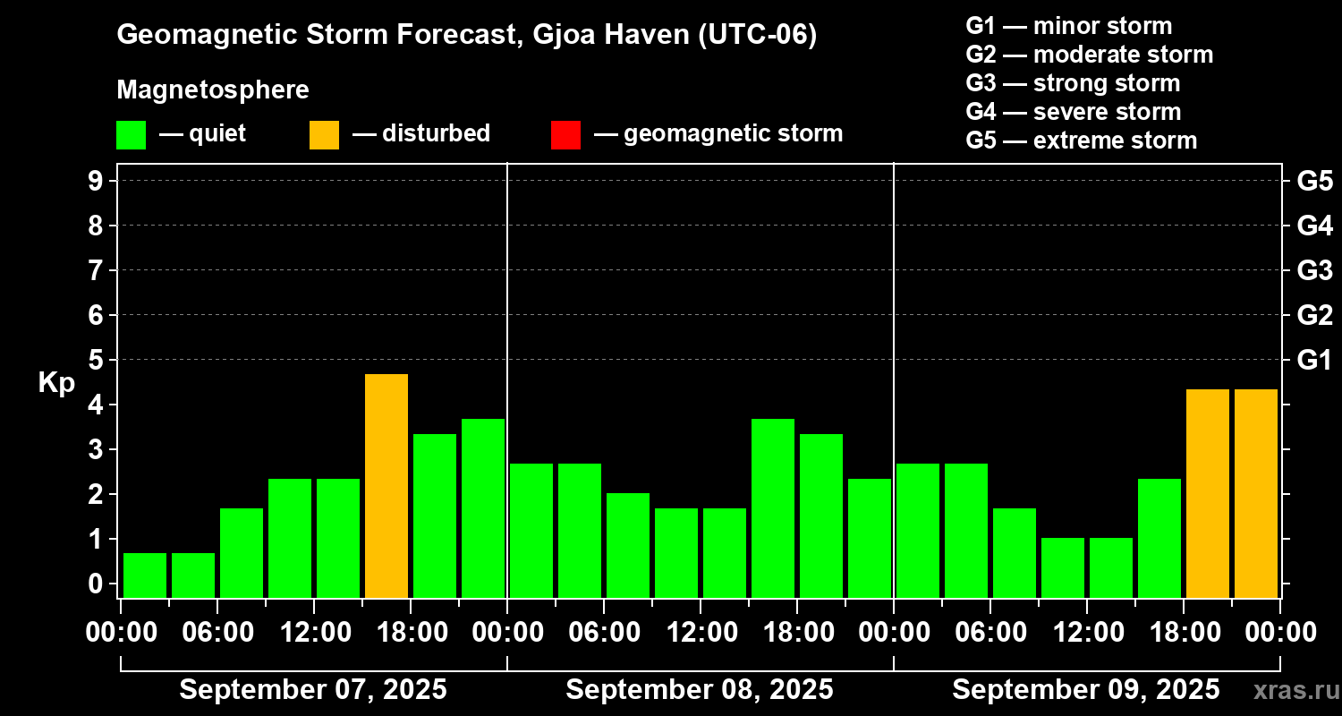 Geomagnetic storm forecast in Gjoa Haven for Sep 07, 2025
