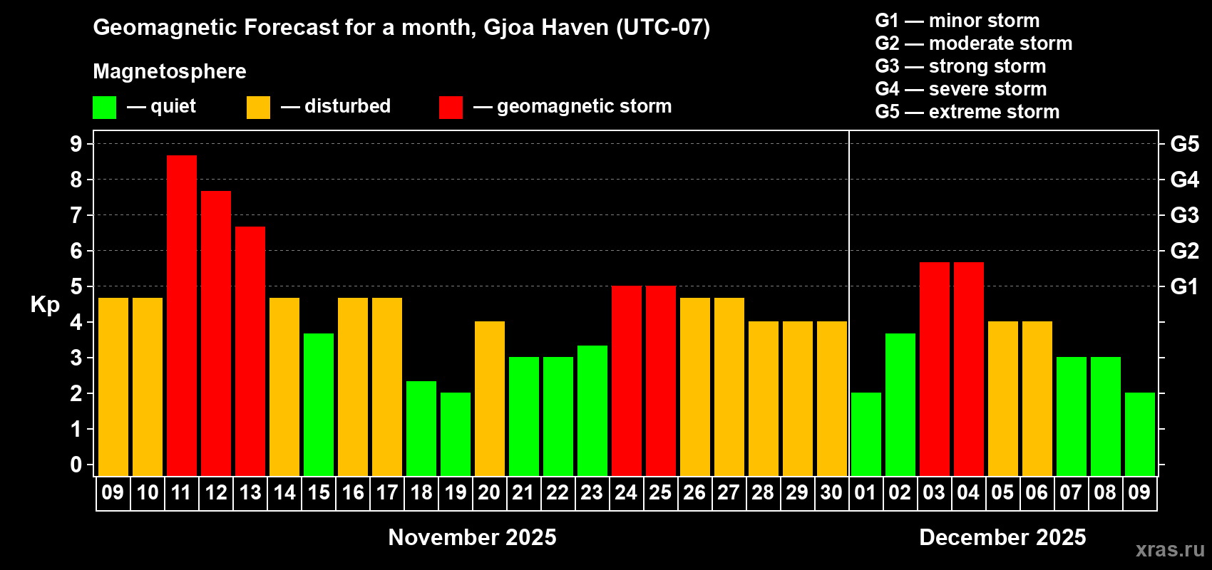 Geomagnetic storm forecast in Gjoa Haven for Nov 09, 2025