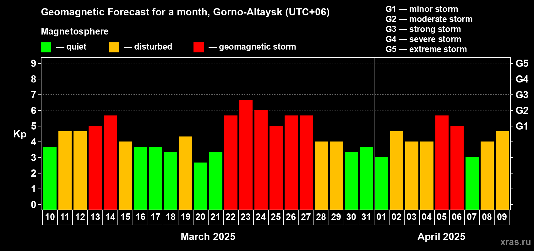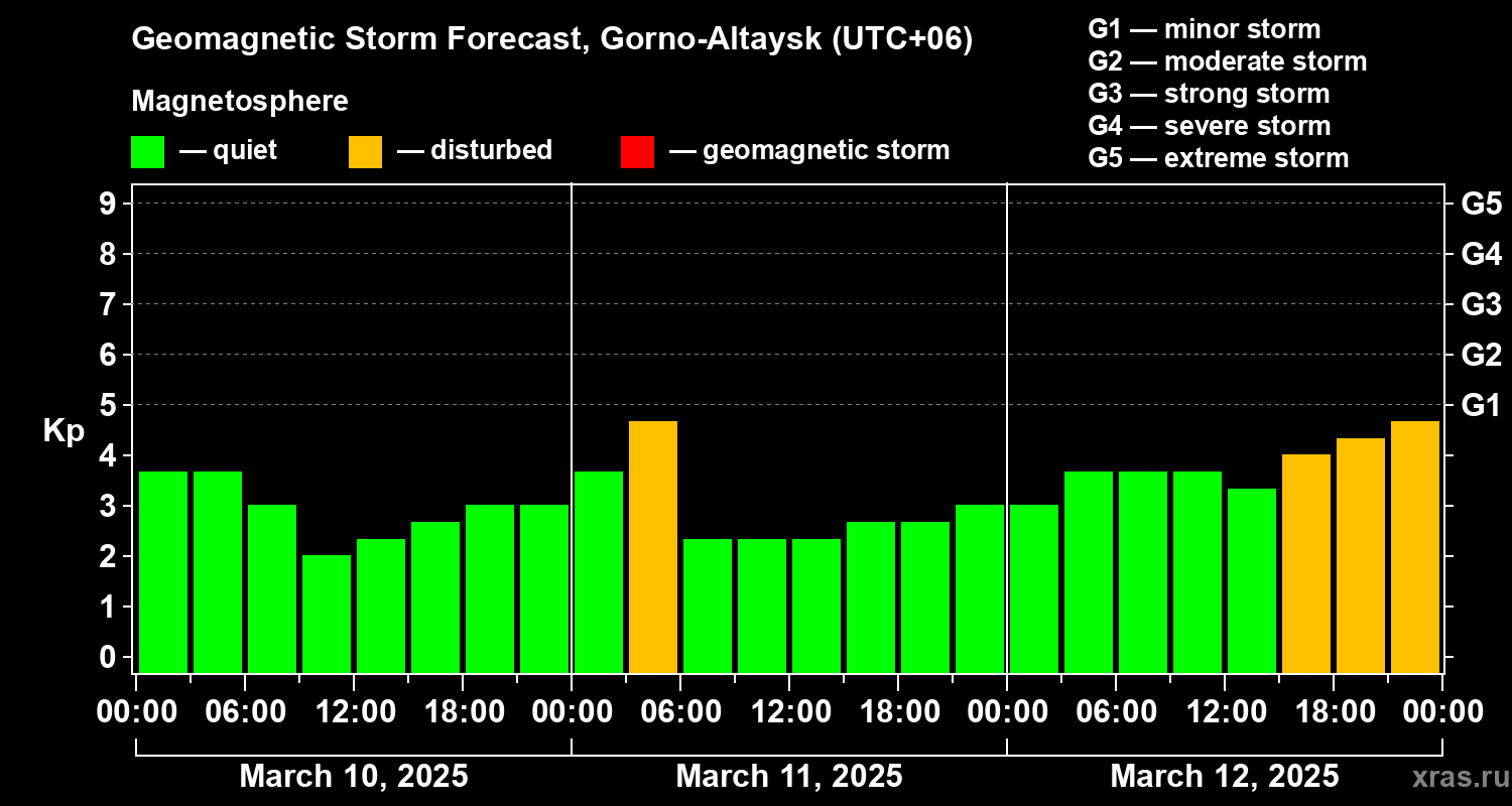 Geomagnetic activity forecast in Gorno-Altaysk — Mar 10, 2025