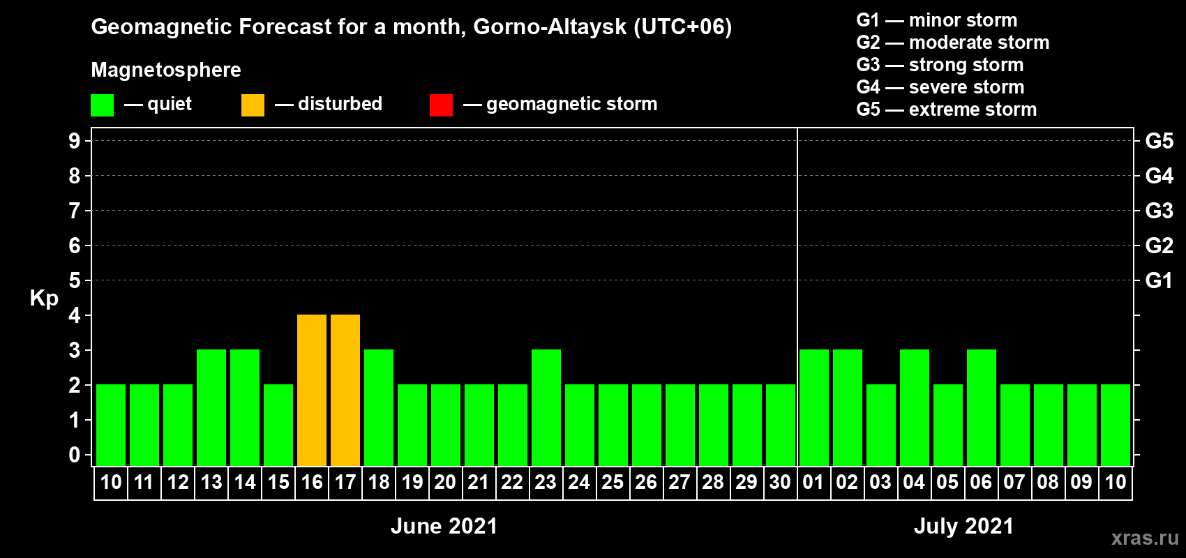 Geomagnetic activity forecast in Gorno-Altaysk — Jun 10, 2021
