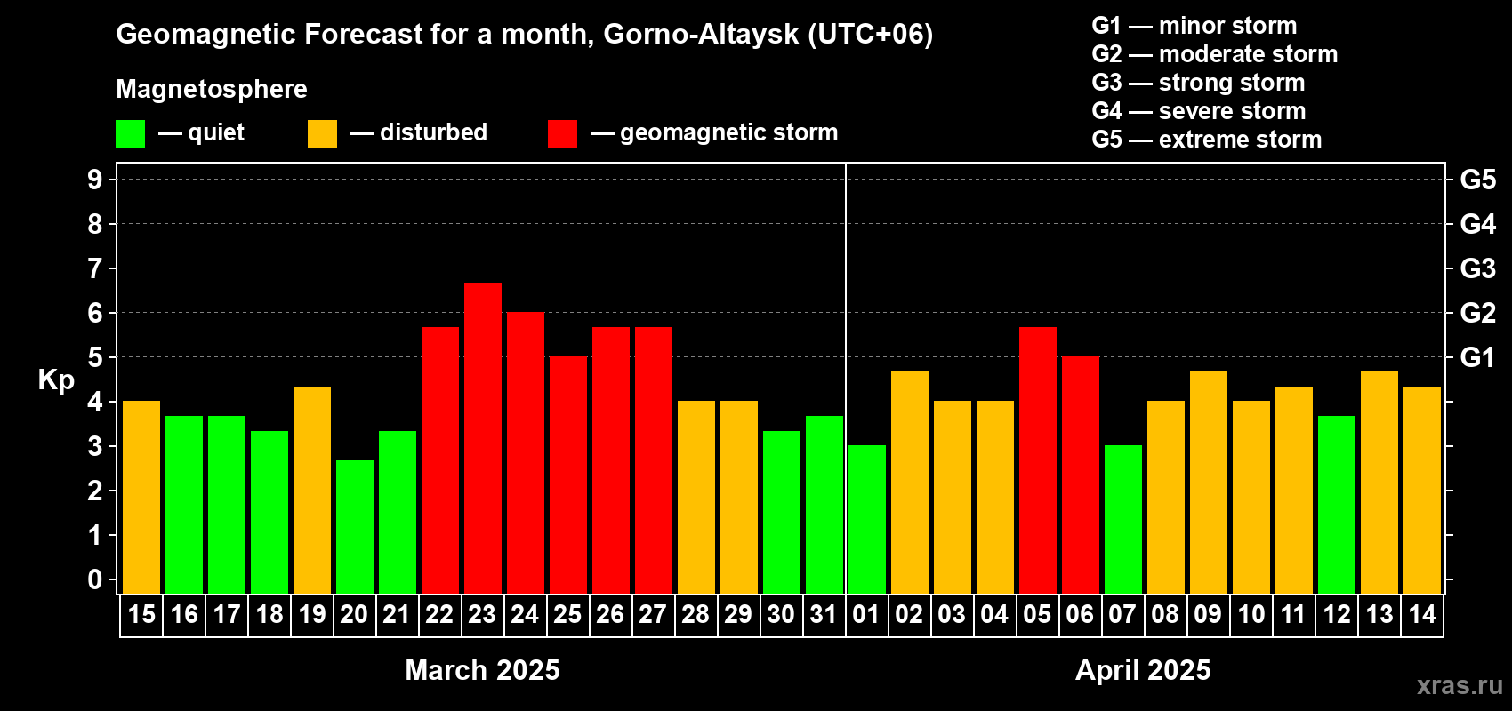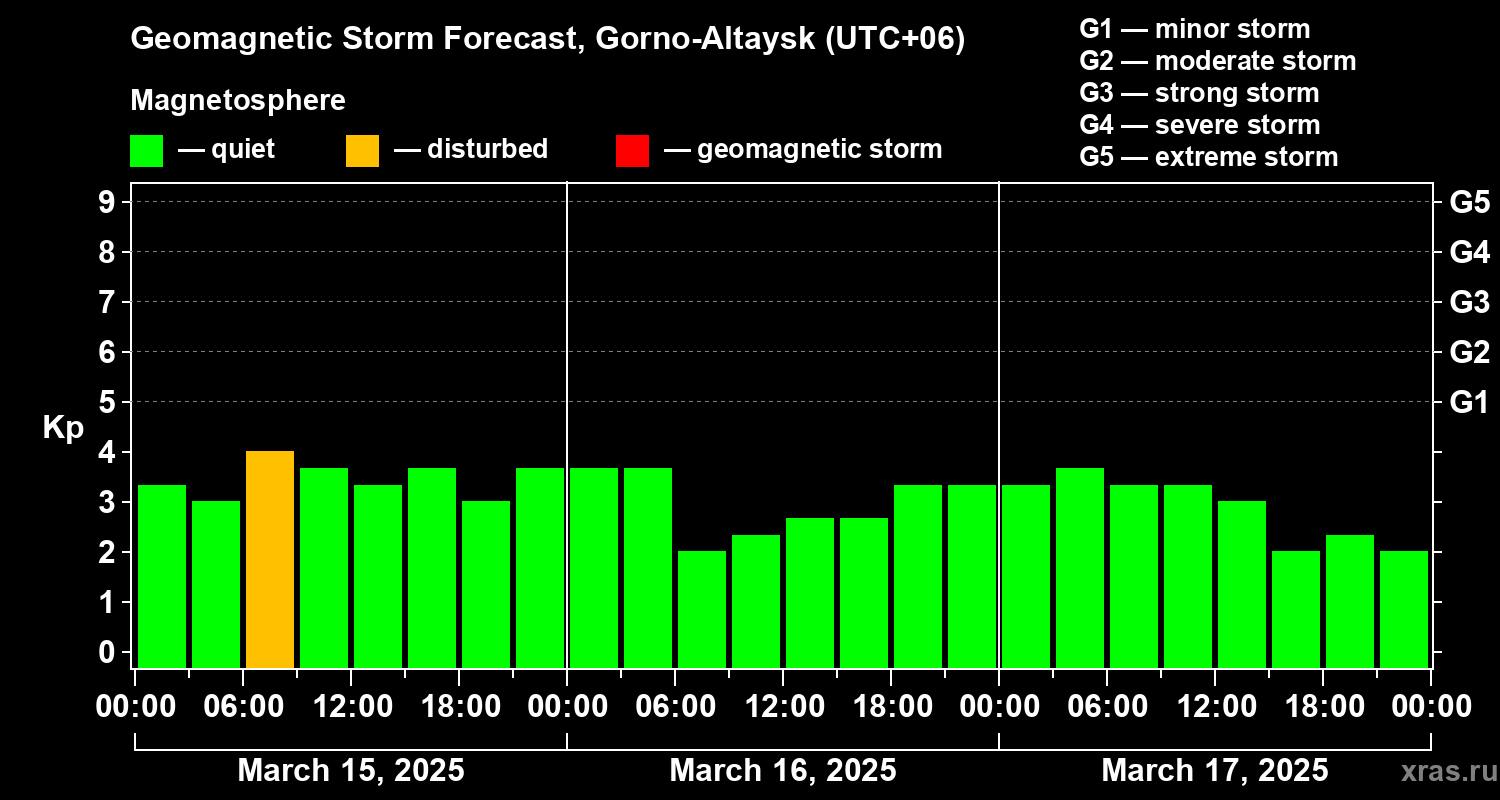 Geomagnetic storm forecast in Gorno-Altaysk for Mar 15, 2025