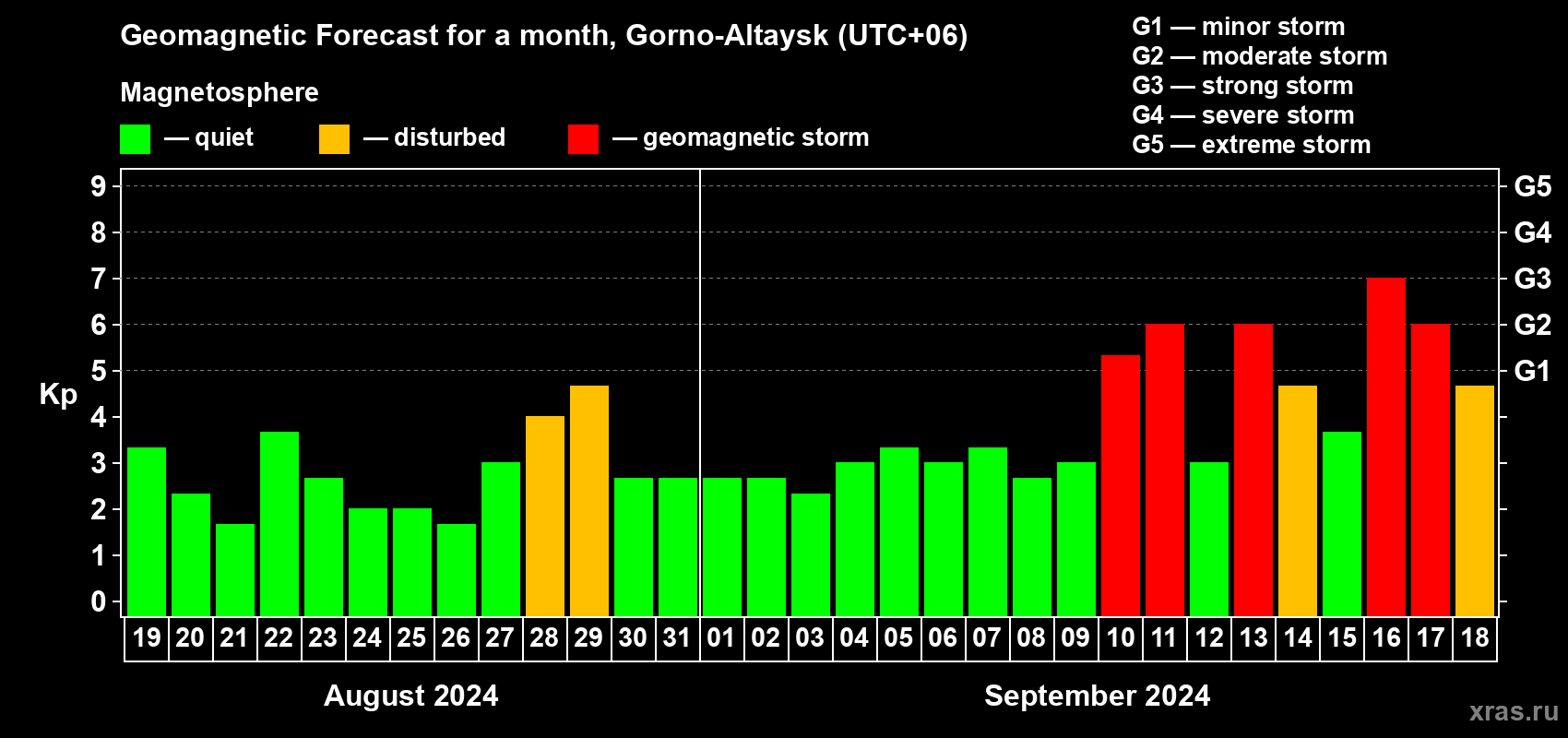 Geomagnetic storm forecast in Gorno-Altaysk for Aug 19, 2024
