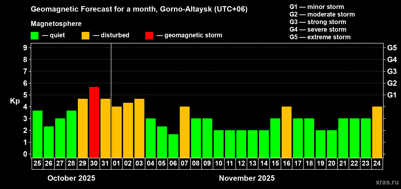 Geomagnetic storm forecast in Gorno-Altaysk for Oct 25, 2025