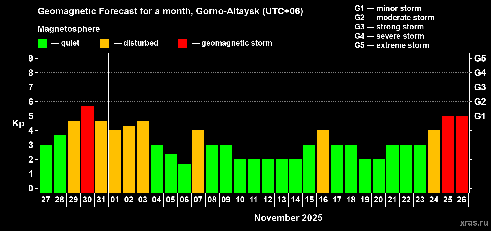 Geomagnetic storm forecast in Gorno-Altaysk for Oct 27, 2025