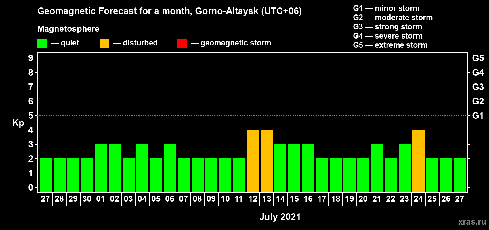 Geomagnetic storm forecast in Gorno-Altaysk for Jun 27, 2021