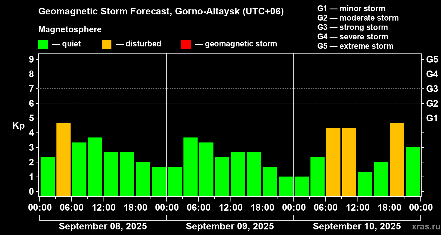 Geomagnetic activity forecast in Gorno-Altaysk — Sep 08, 2025