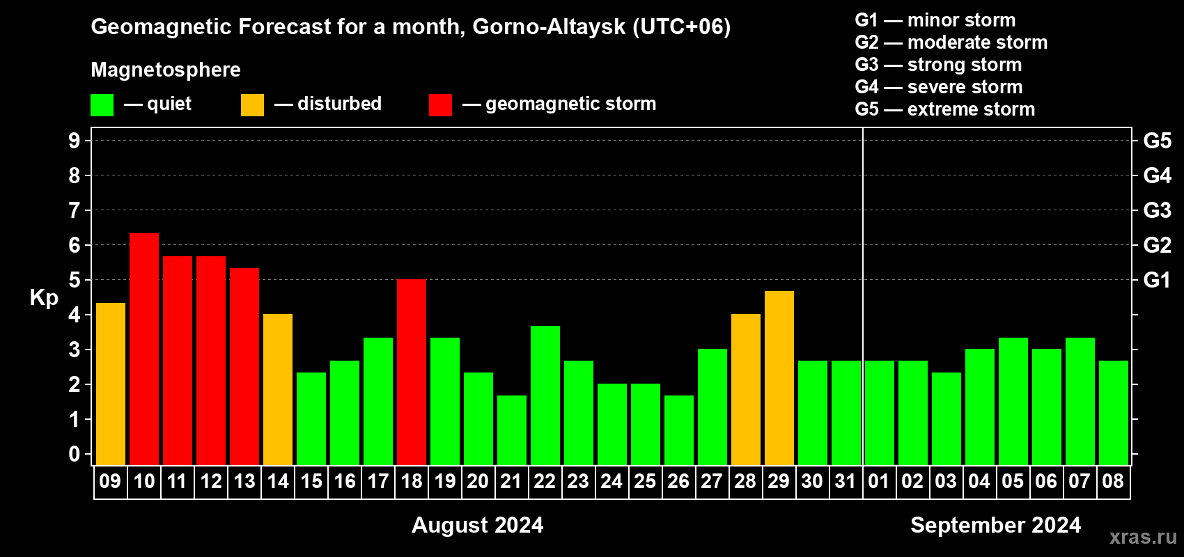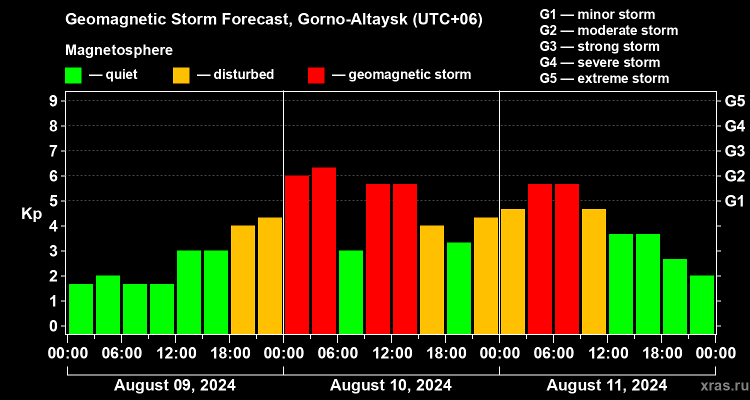 Geomagnetic storm forecast in Gorno-Altaysk for Aug 09, 2024