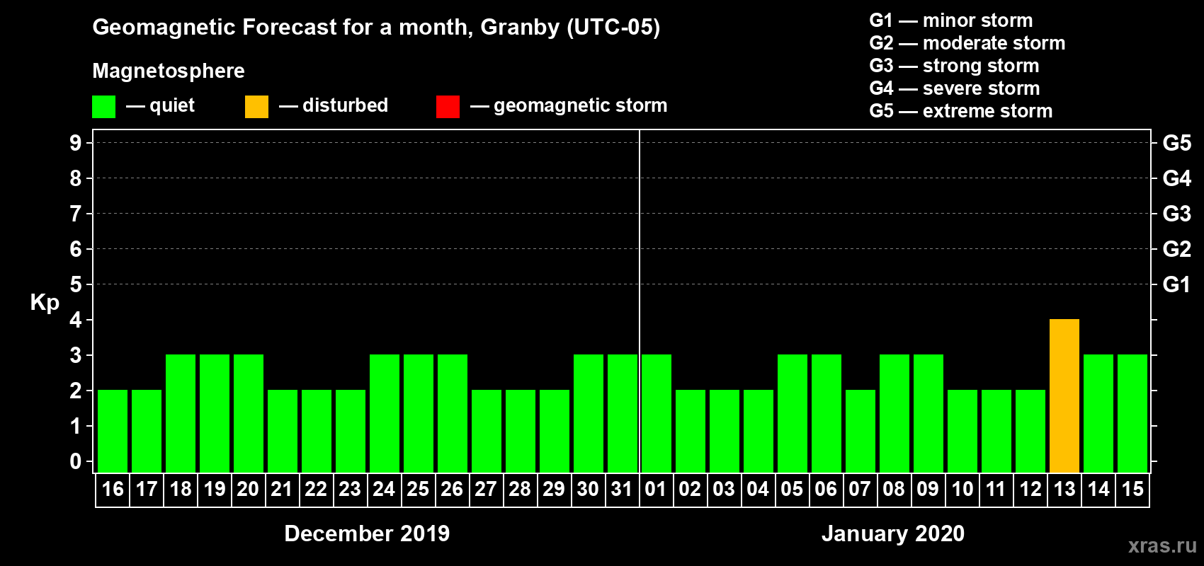 Geomagnetic storm forecast in Granby for Dec 16, 2019