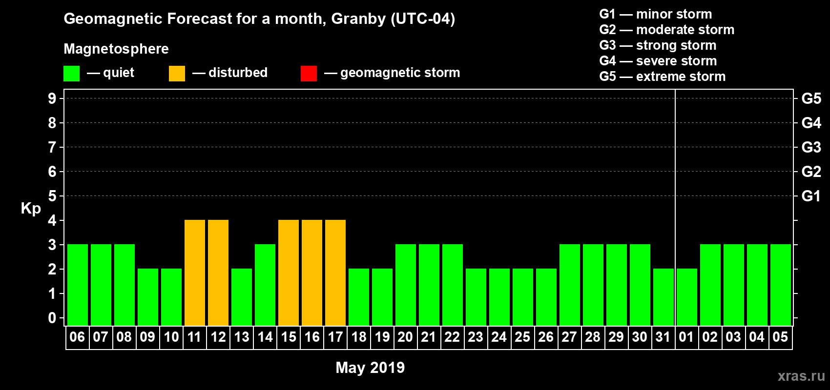 Geomagnetic storm forecast in Granby for May 06, 2019