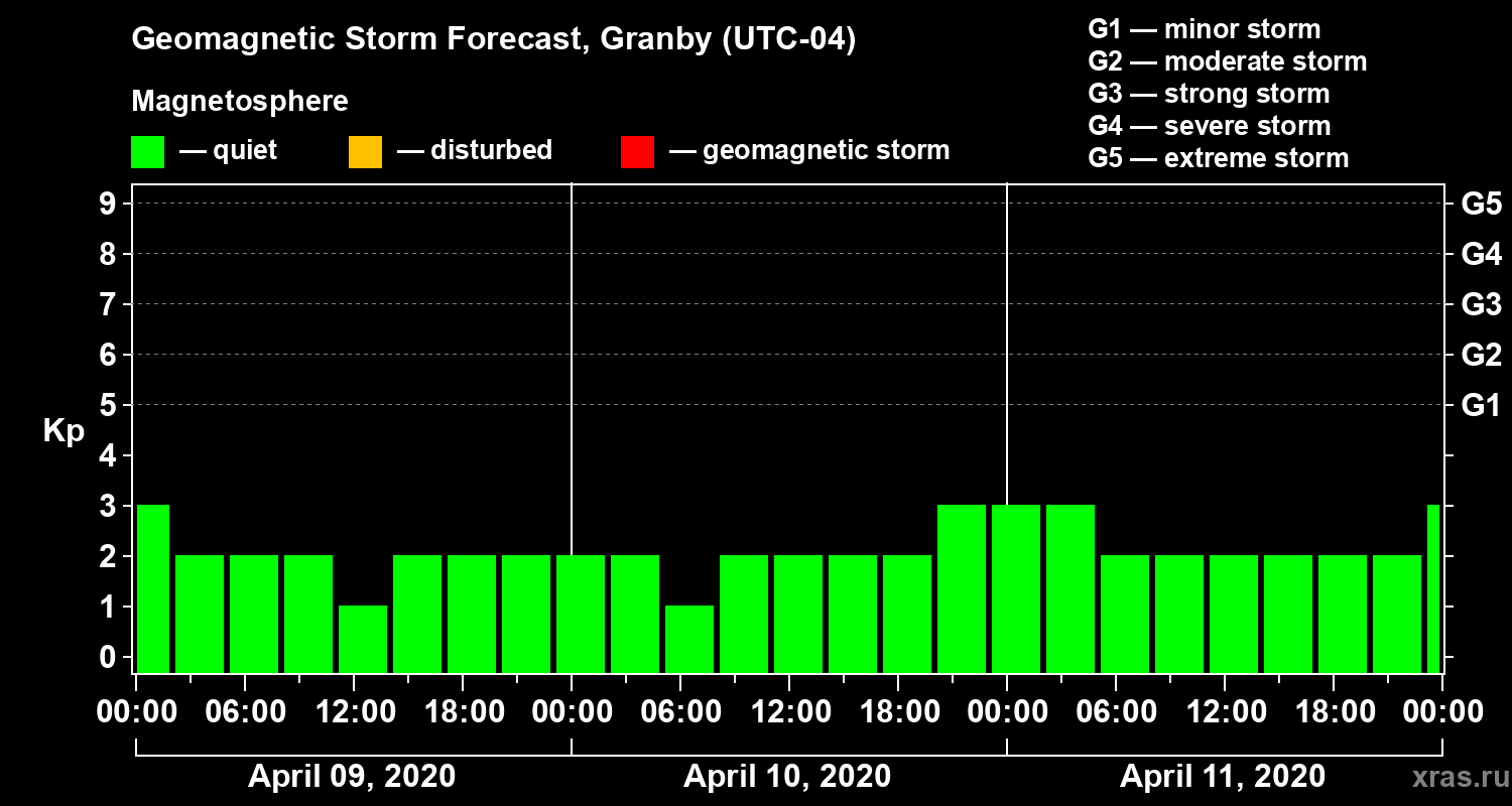 Geomagnetic storm forecast in Granby for Apr 09, 2020