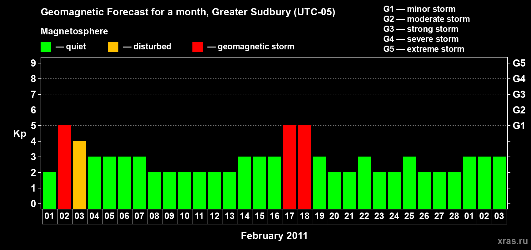 Geomagnetic storm forecast in Greater Sudbury for Feb 01, 2011