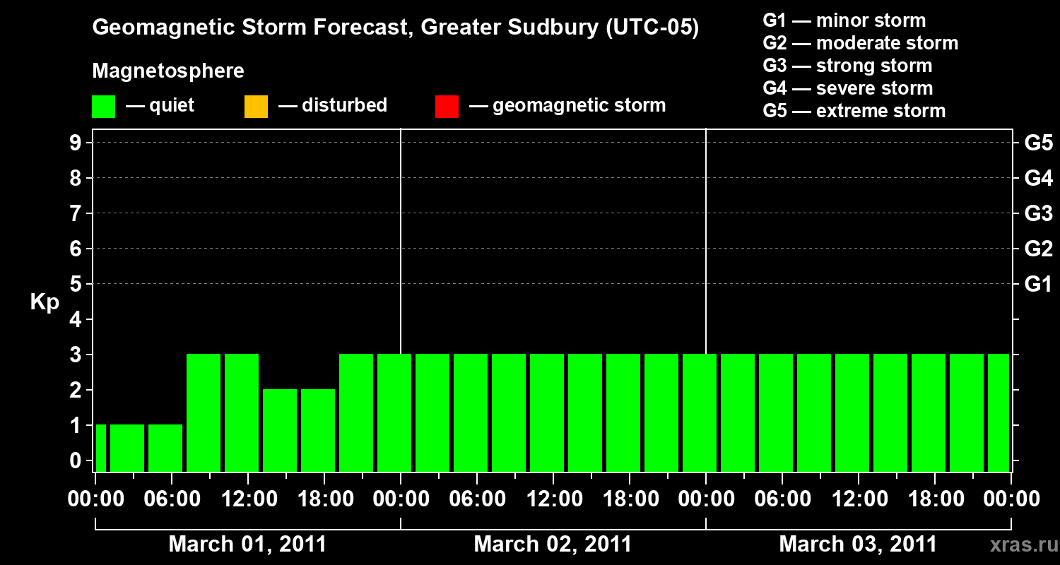 Geomagnetic storm forecast in Greater Sudbury for Mar 01, 2011