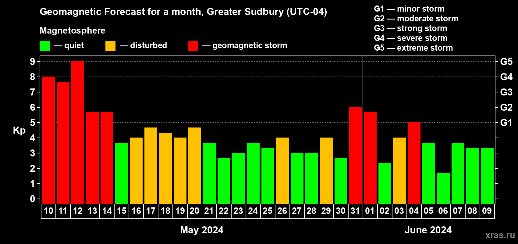 Geomagnetic storm forecast in Greater Sudbury for May 10, 2024