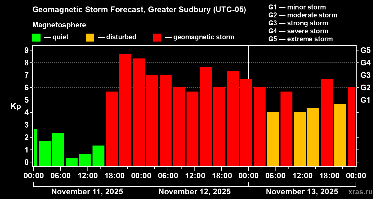 Geomagnetic storm forecast in Greater Sudbury for Nov 11, 2025