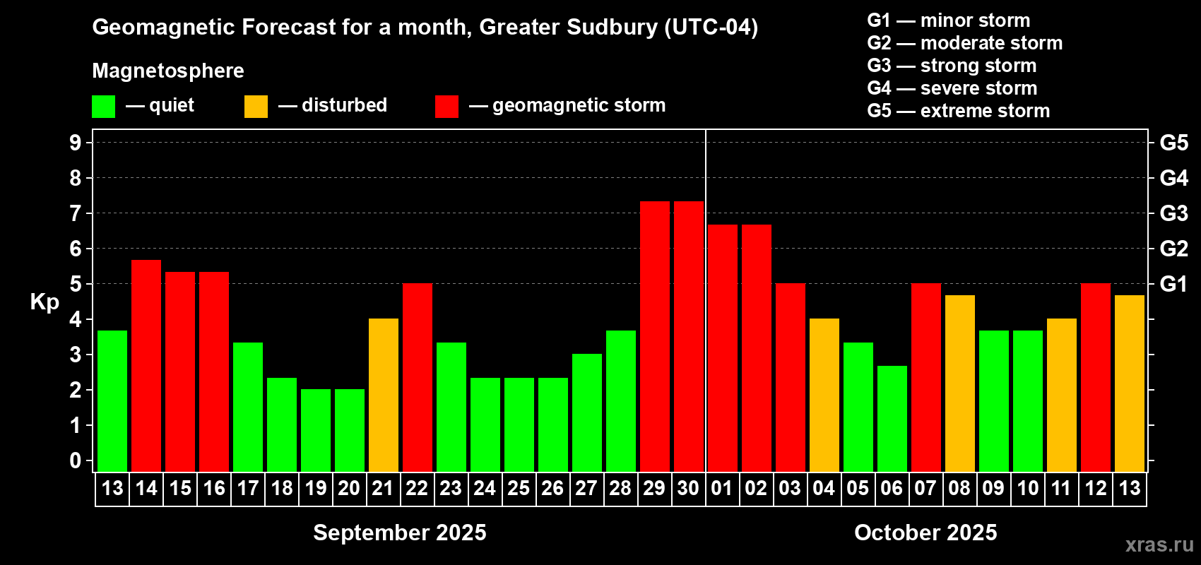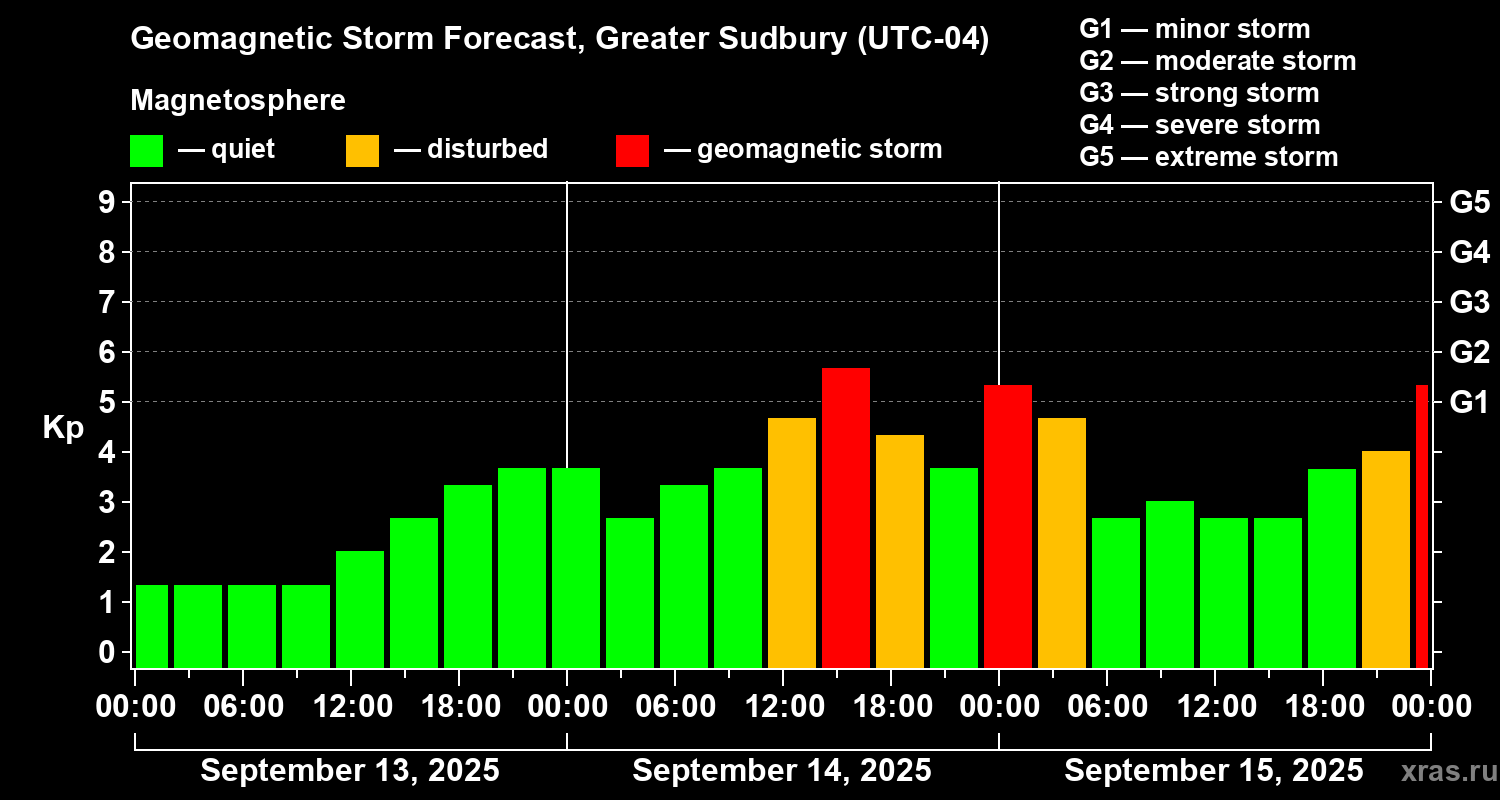 Geomagnetic storm forecast in Greater Sudbury for Sep 13, 2025