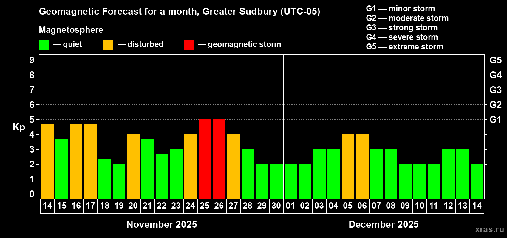 Geomagnetic storm forecast in Greater Sudbury for Nov 14, 2025