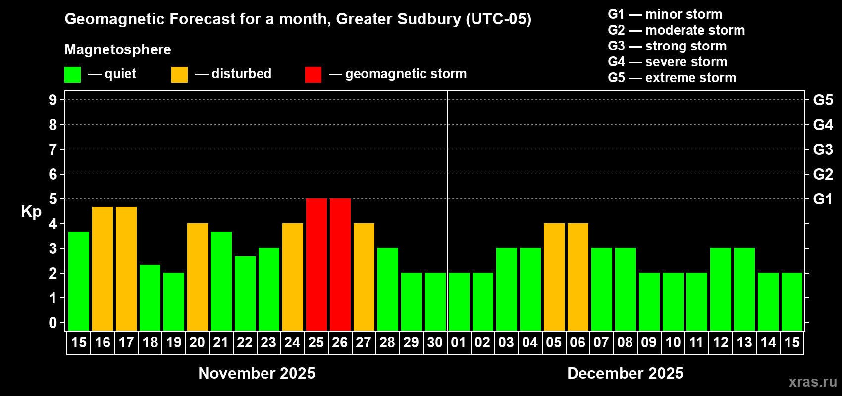 Geomagnetic storm forecast in Greater Sudbury for Nov 15, 2025