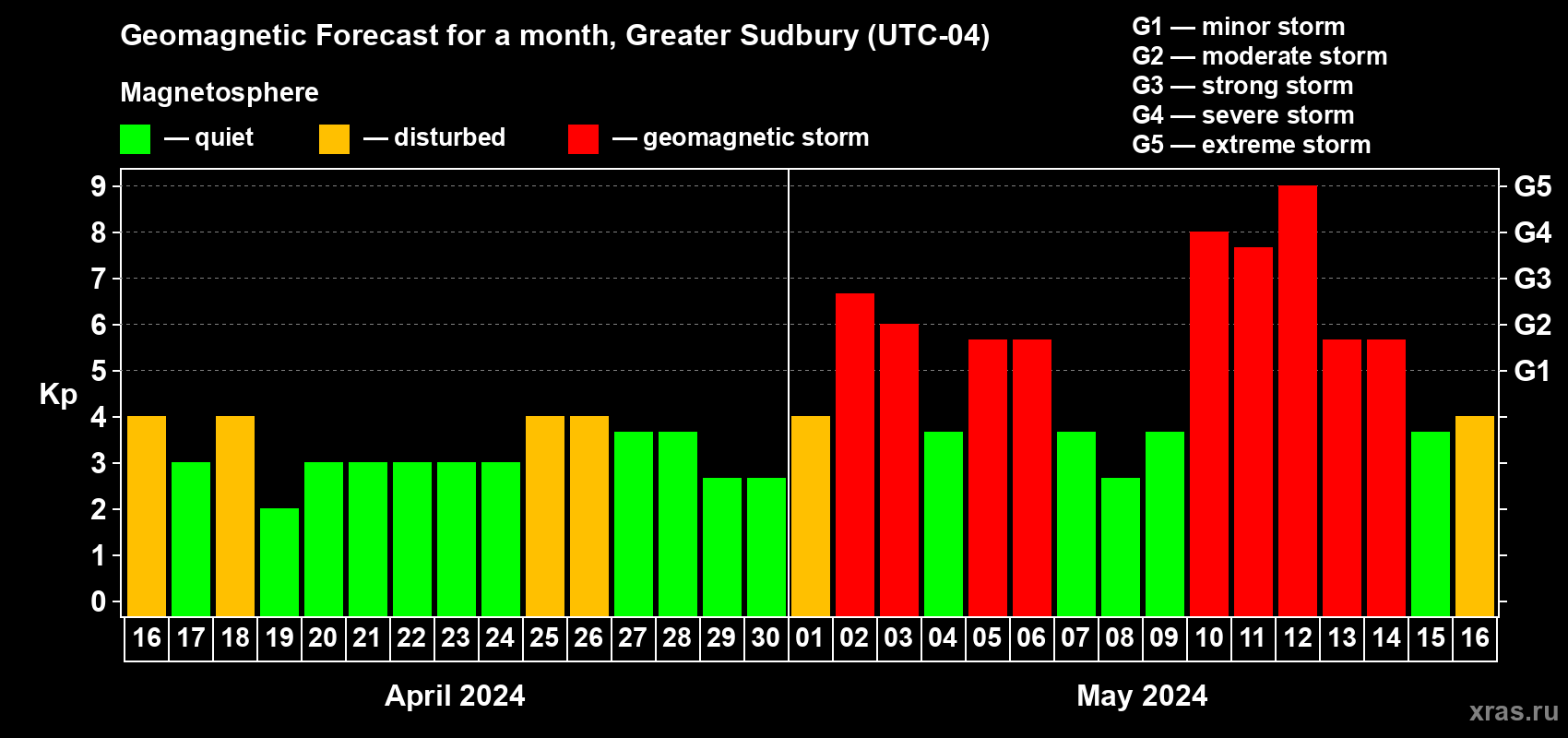 Geomagnetic storm forecast in Greater Sudbury for Apr 16, 2024