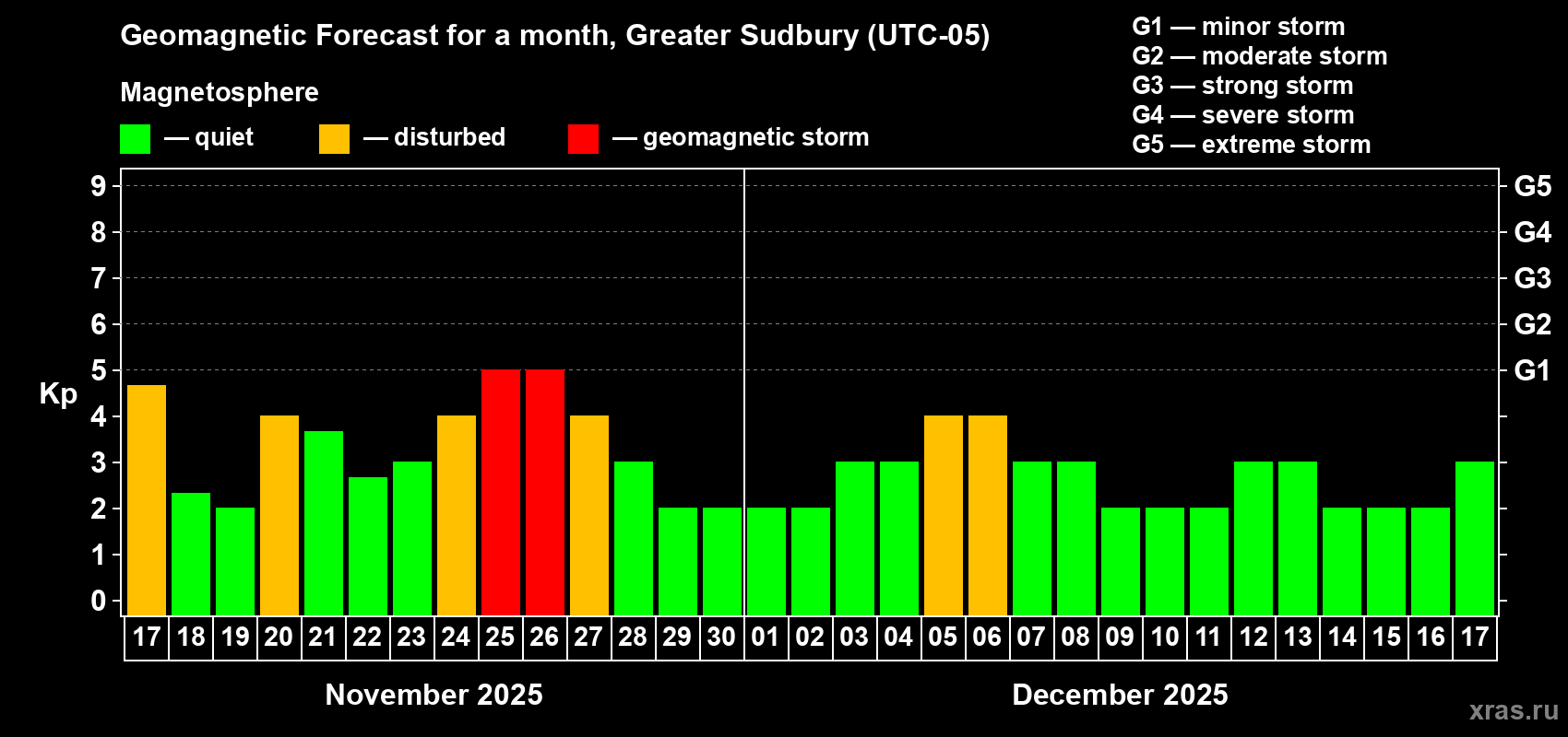 Geomagnetic storm forecast in Greater Sudbury for Nov 17, 2025