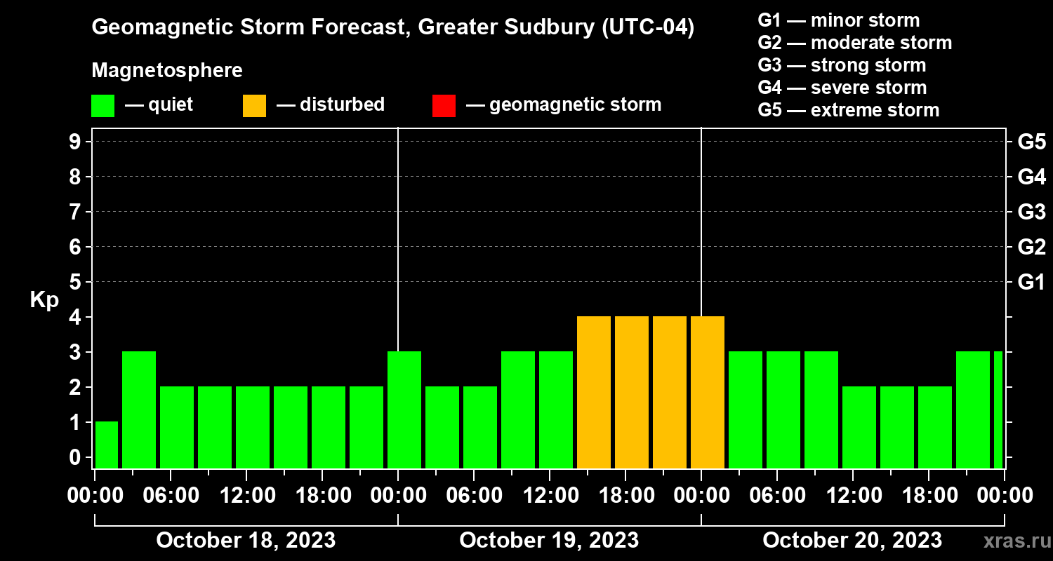 Geomagnetic storm forecast in Greater Sudbury for Oct 18, 2023