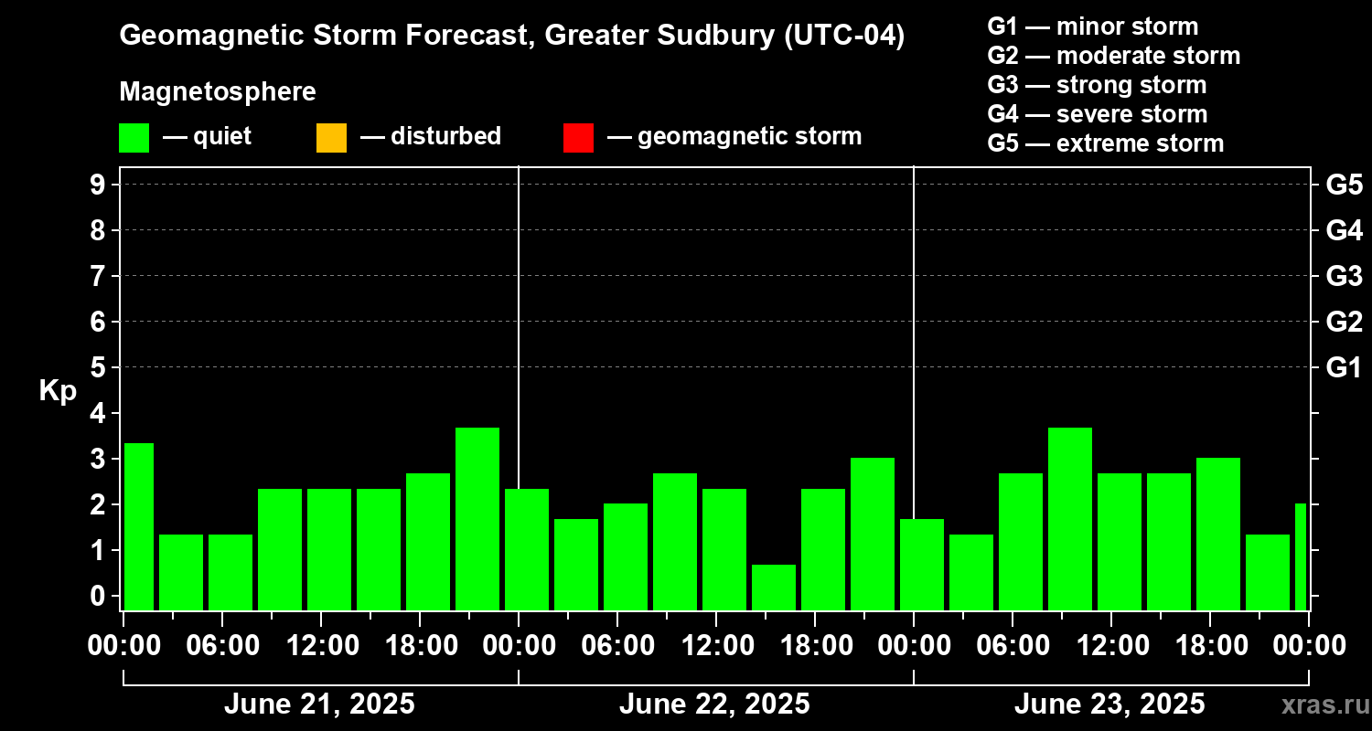 Geomagnetic storm forecast in Greater Sudbury for Jun 21, 2025