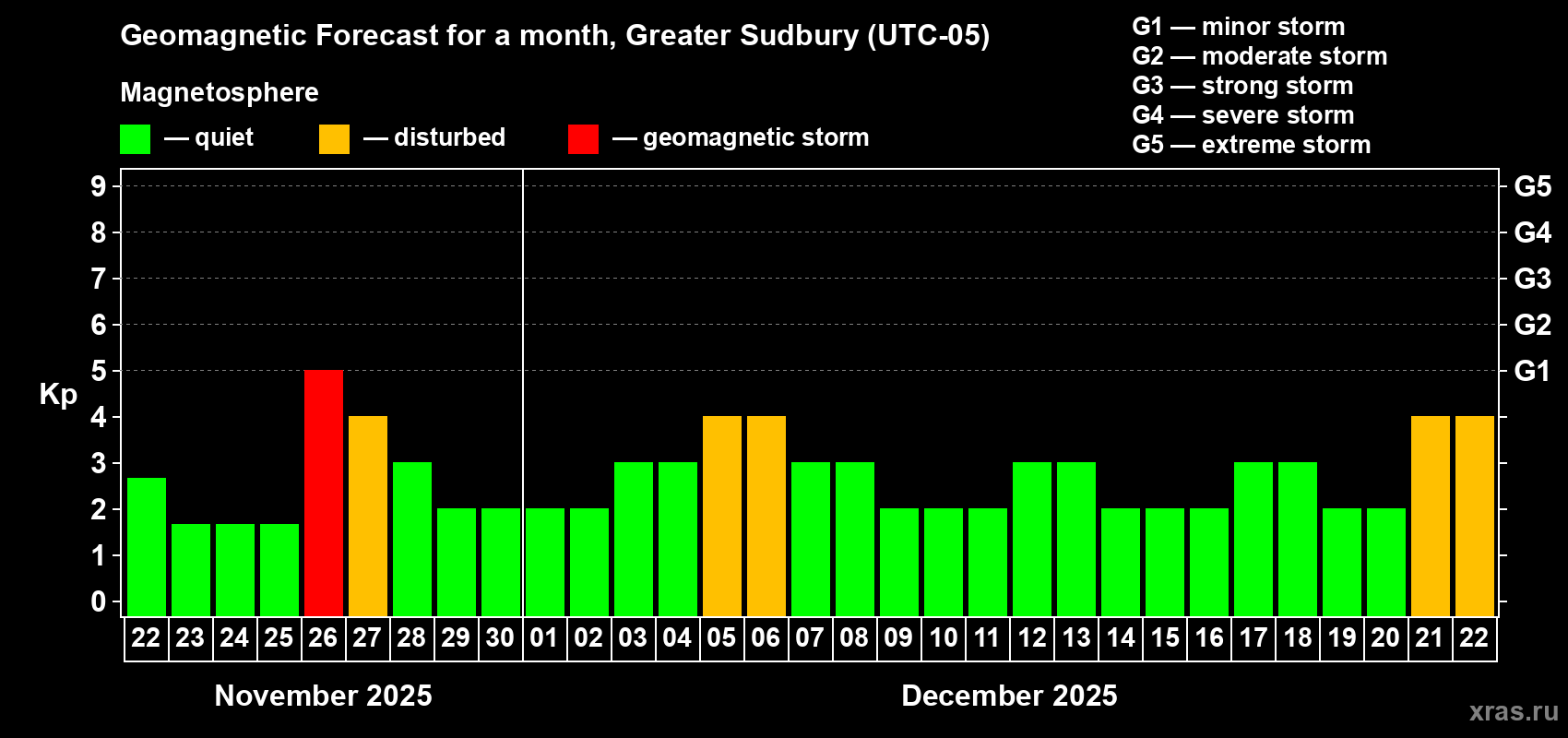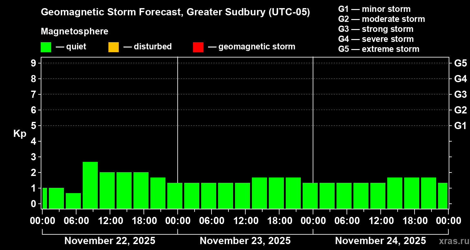 Geomagnetic storm forecast in Greater Sudbury for Nov 22, 2025