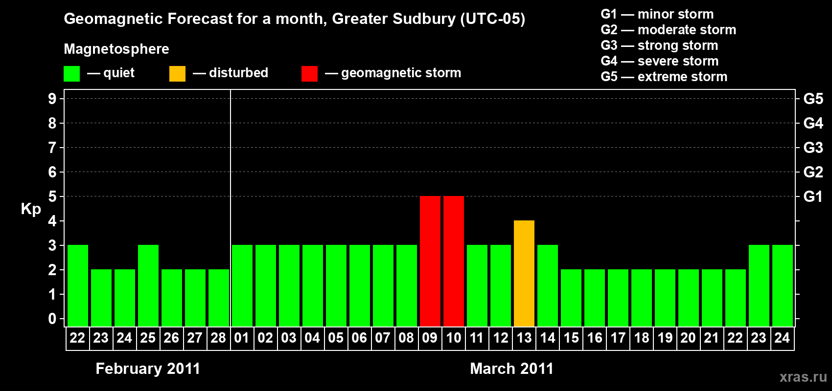Geomagnetic storm forecast in Greater Sudbury for Feb 22, 2011