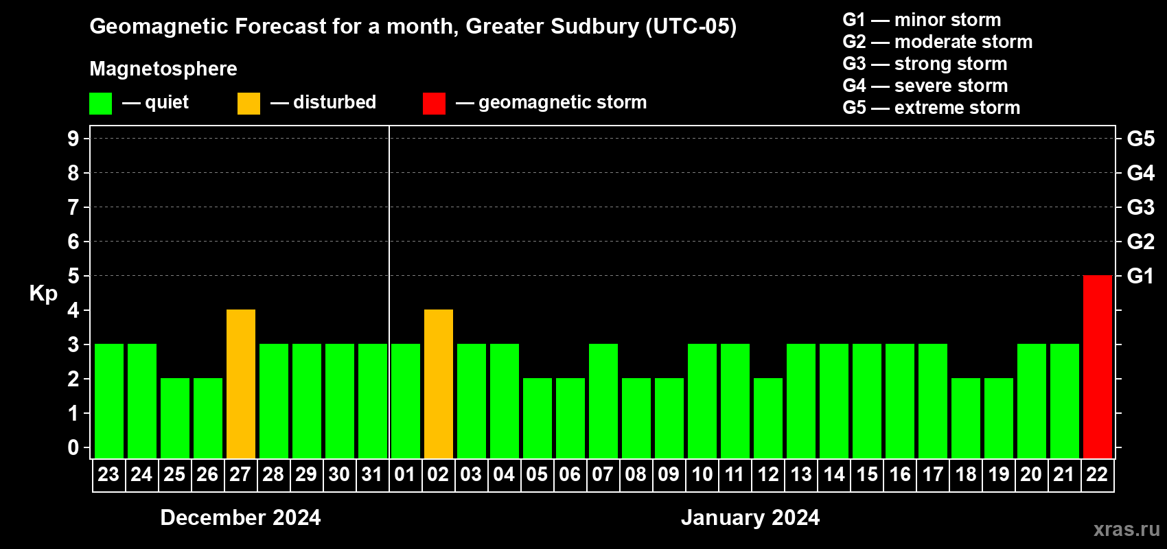 Geomagnetic storm forecast in Greater Sudbury for Dec 23, 2023