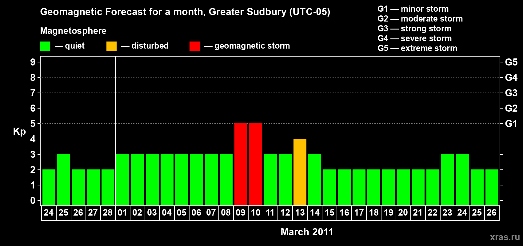 Geomagnetic storm forecast in Greater Sudbury for Feb 24, 2011