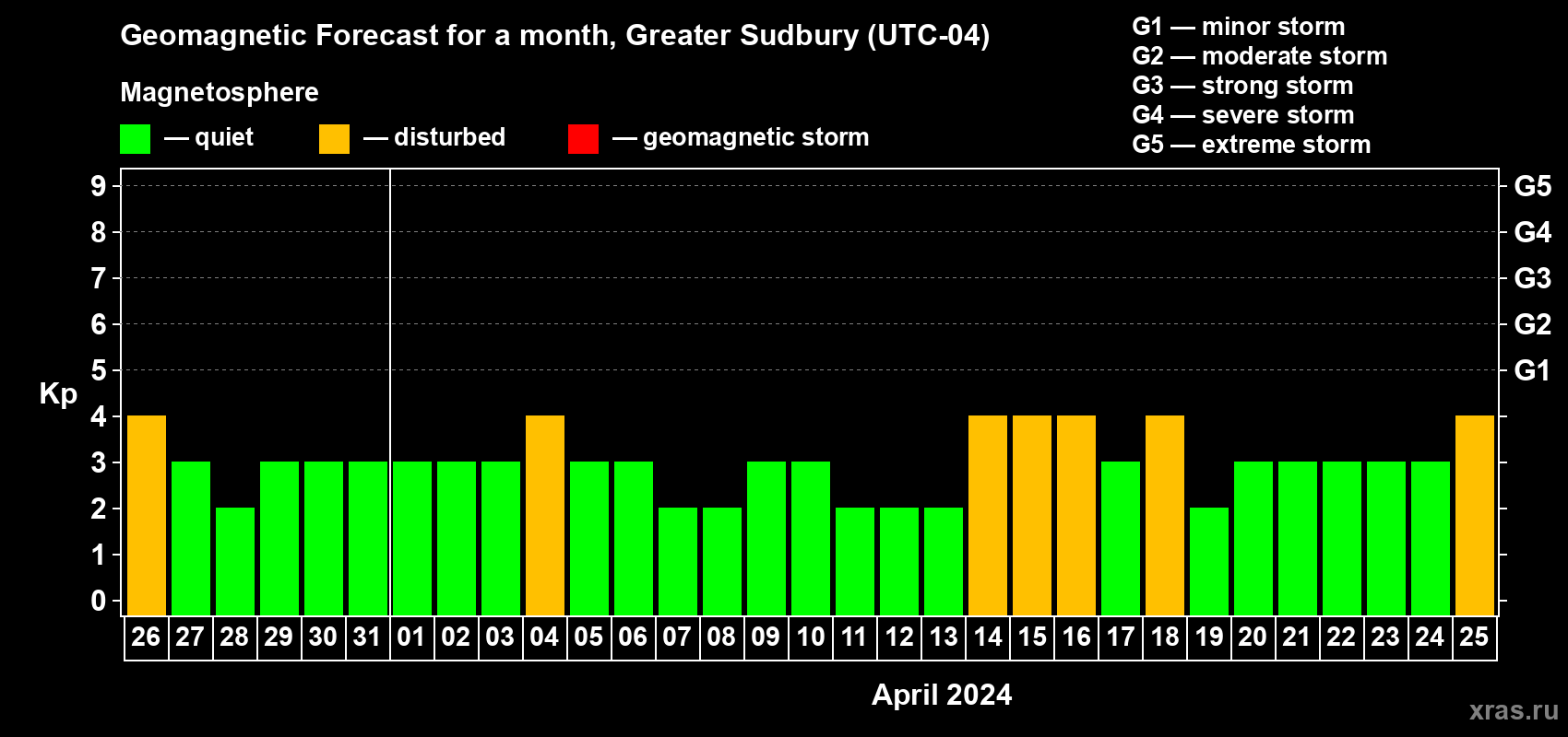 Geomagnetic activity forecast in Greater Sudbury — Mar 26, 2024