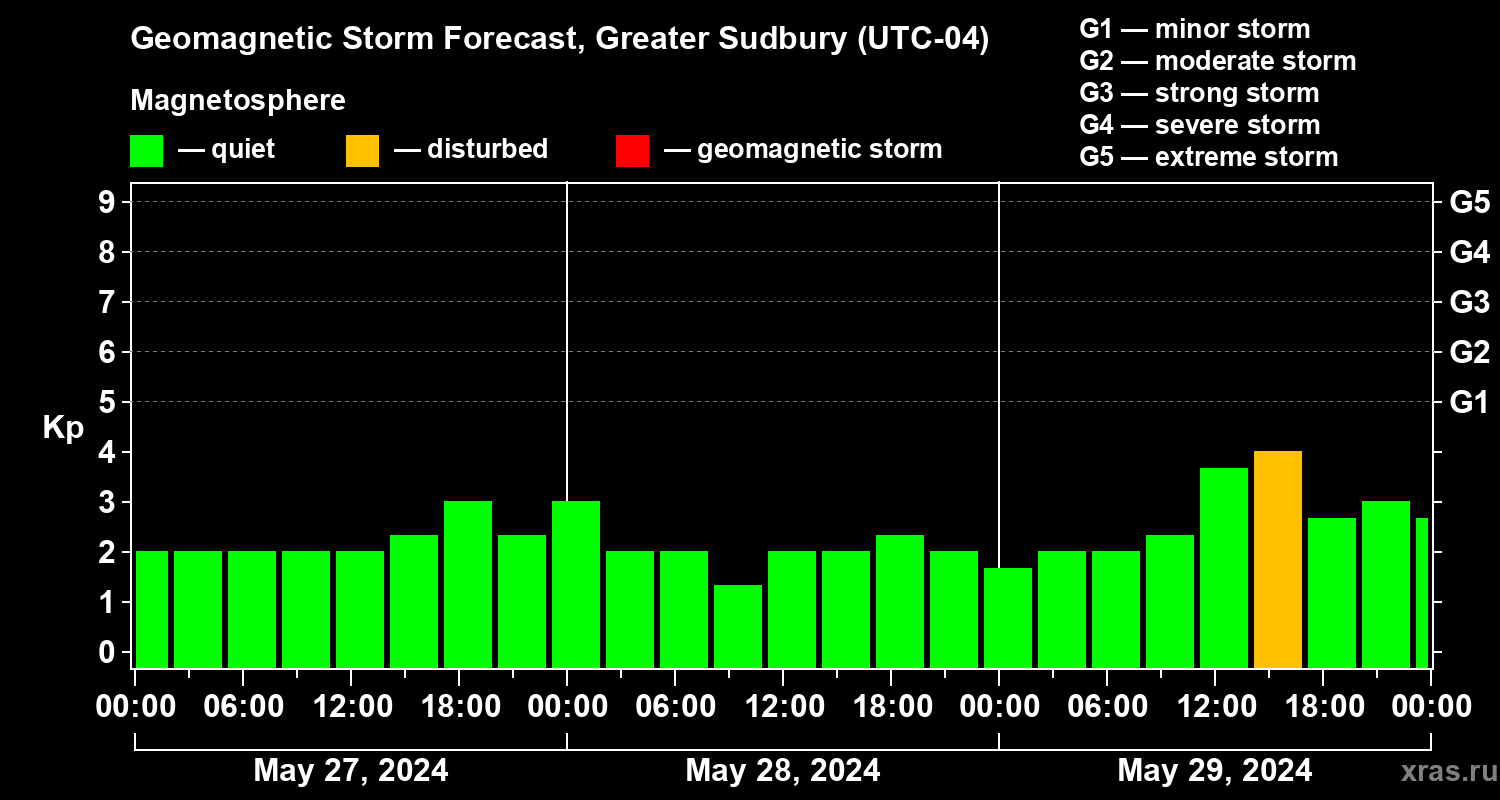 Geomagnetic storm forecast in Greater Sudbury for May 27, 2024