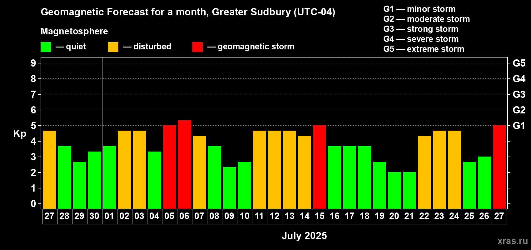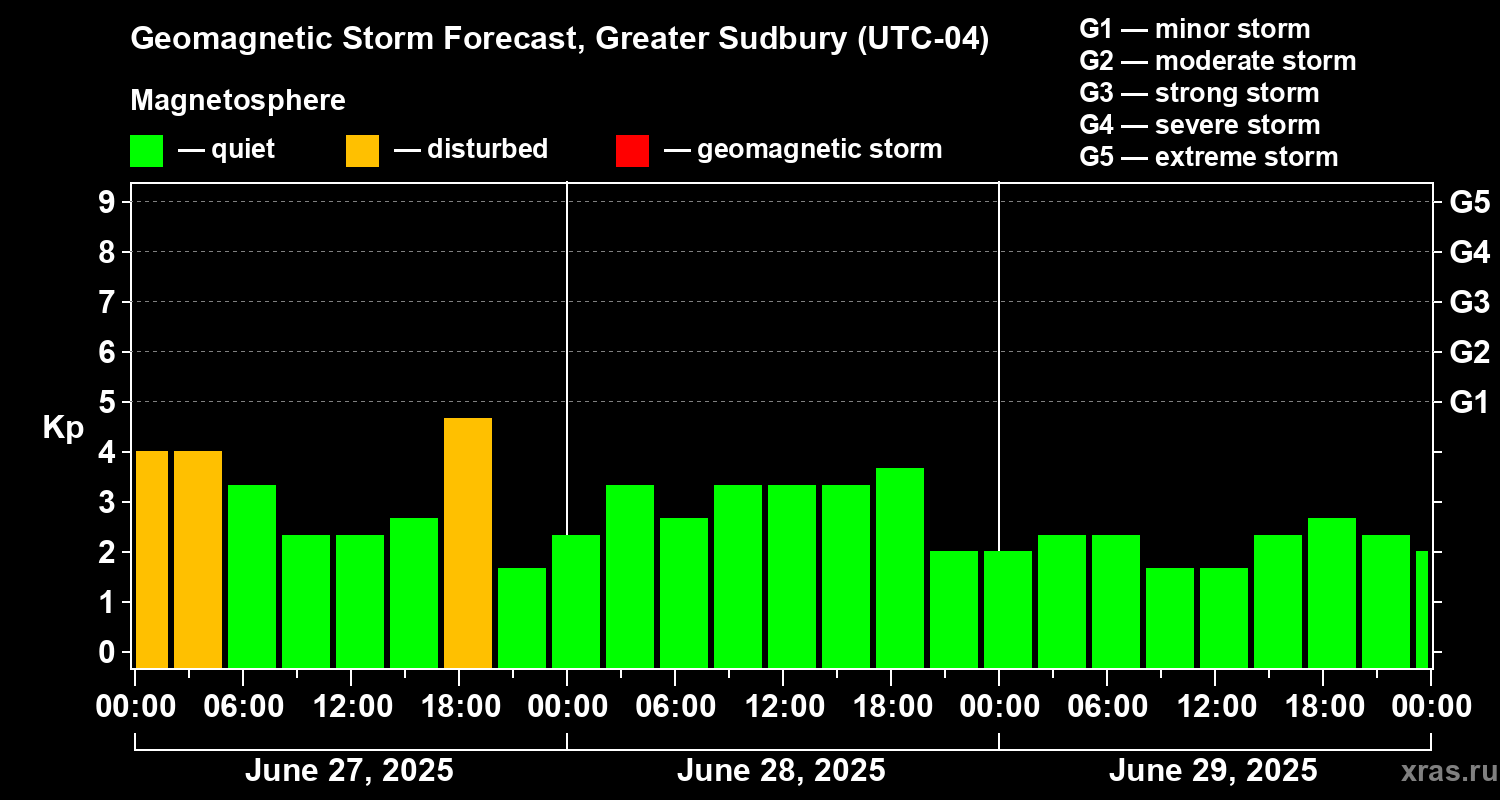 Geomagnetic storm forecast in Greater Sudbury for Jun 27, 2025
