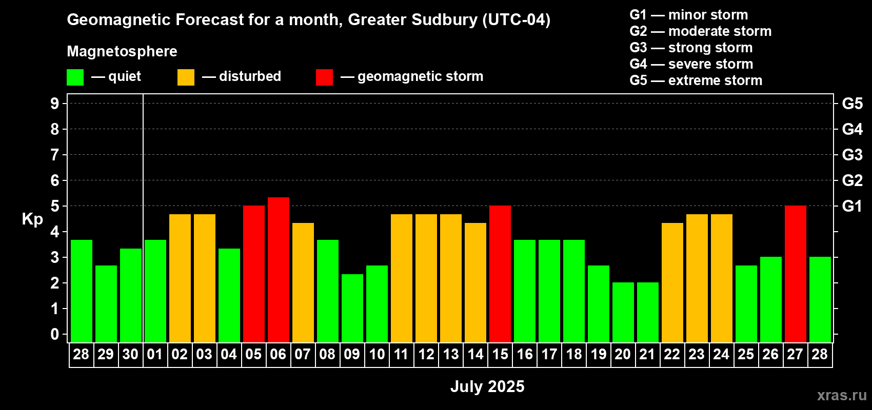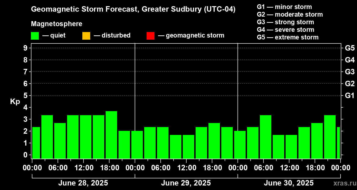 Geomagnetic storm forecast in Greater Sudbury for Jun 28, 2025