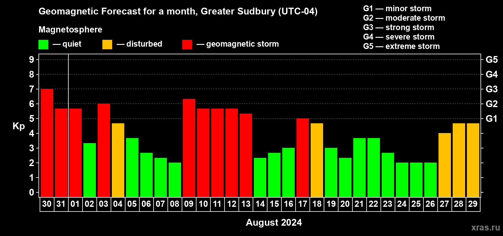 Geomagnetic activity forecast in Greater Sudbury — Jul 30, 2024