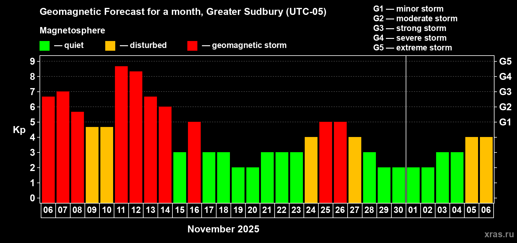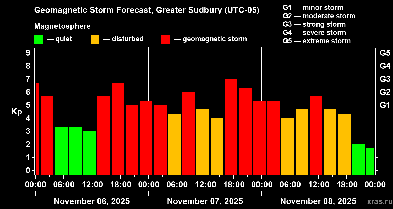 Geomagnetic storm forecast in Greater Sudbury for Nov 06, 2025