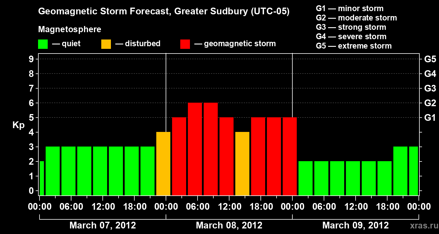 Geomagnetic storm forecast in Greater Sudbury for Mar 07, 2012