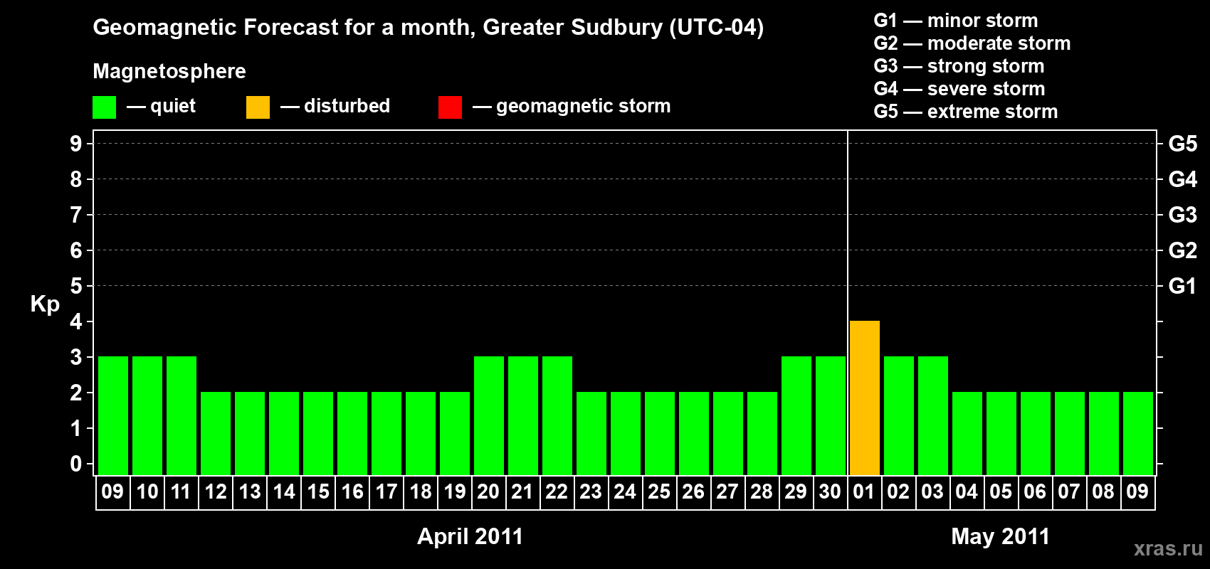 Geomagnetic storm forecast in Greater Sudbury for Apr 09, 2011