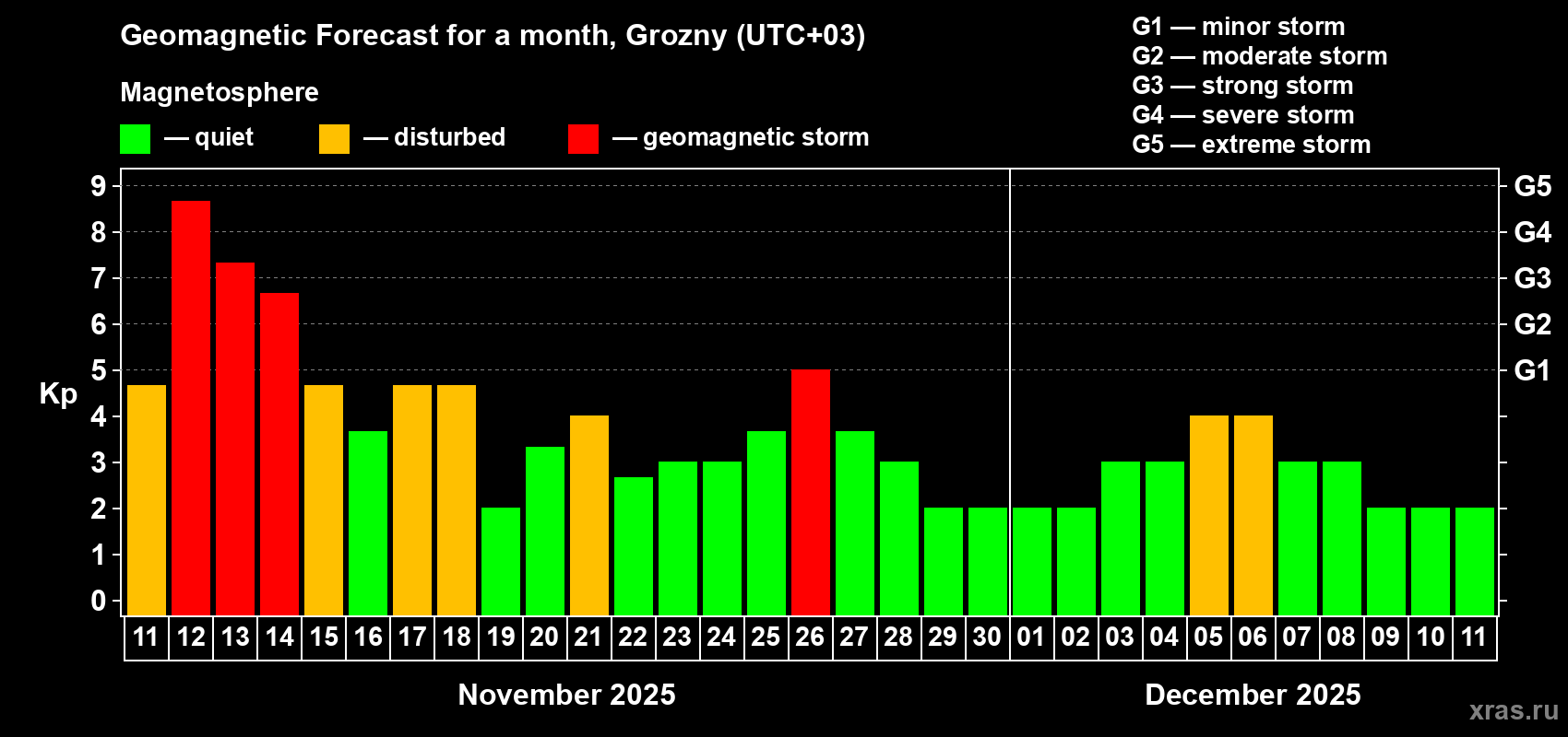 Geomagnetic storm forecast in Grozny for Nov 11, 2025