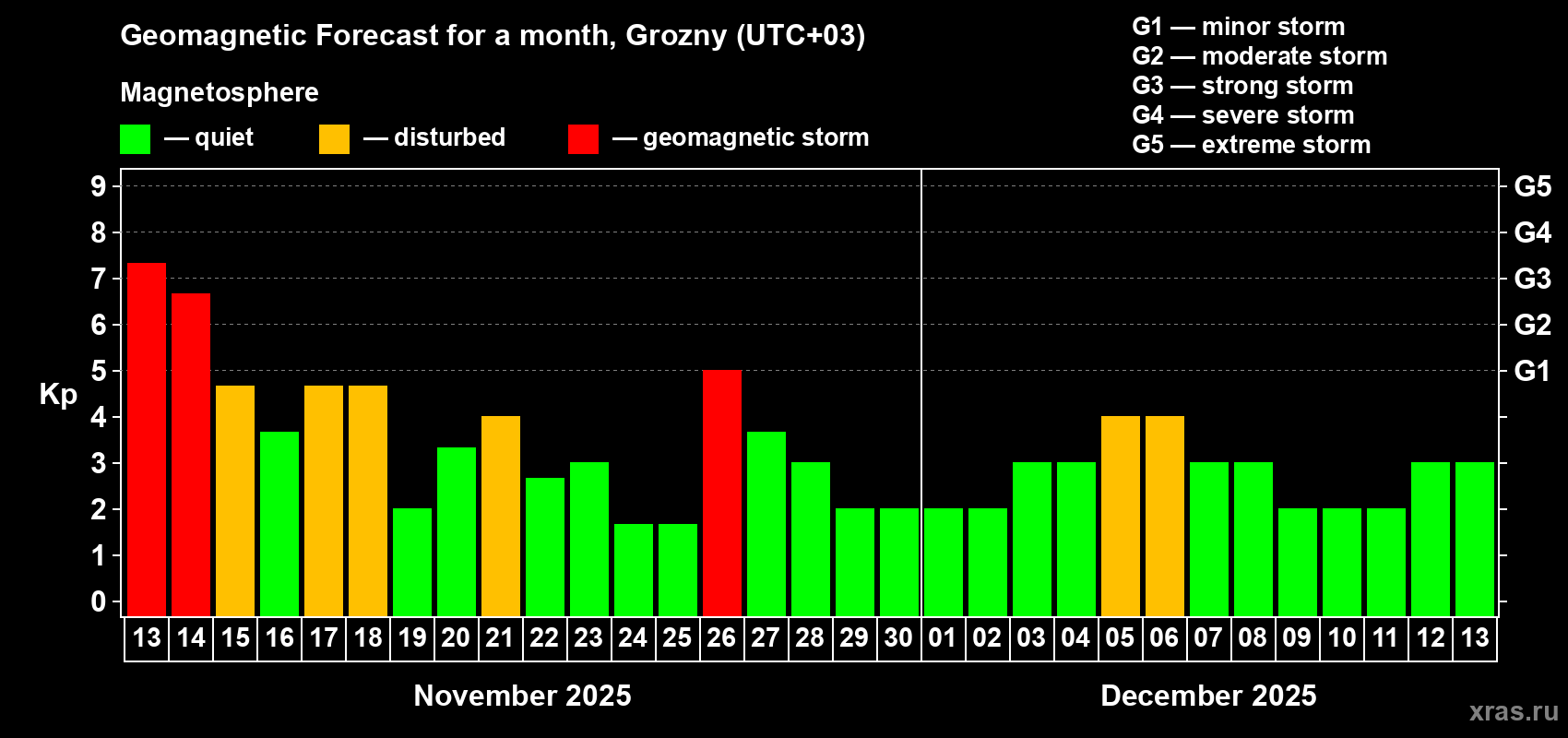 Geomagnetic storm forecast in Grozny for Nov 13, 2025