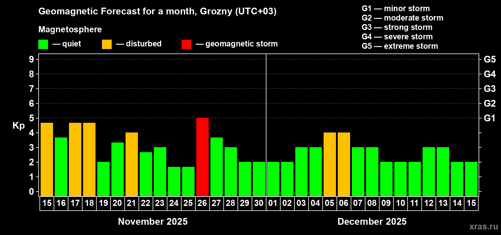 Geomagnetic storm forecast in Grozny for Nov 15, 2025