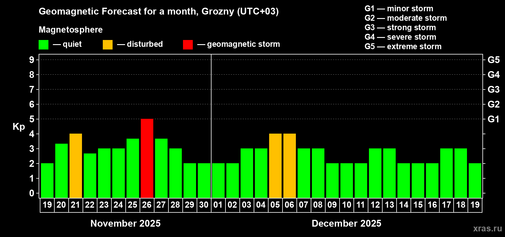 Geomagnetic storm forecast in Grozny for Nov 19, 2025