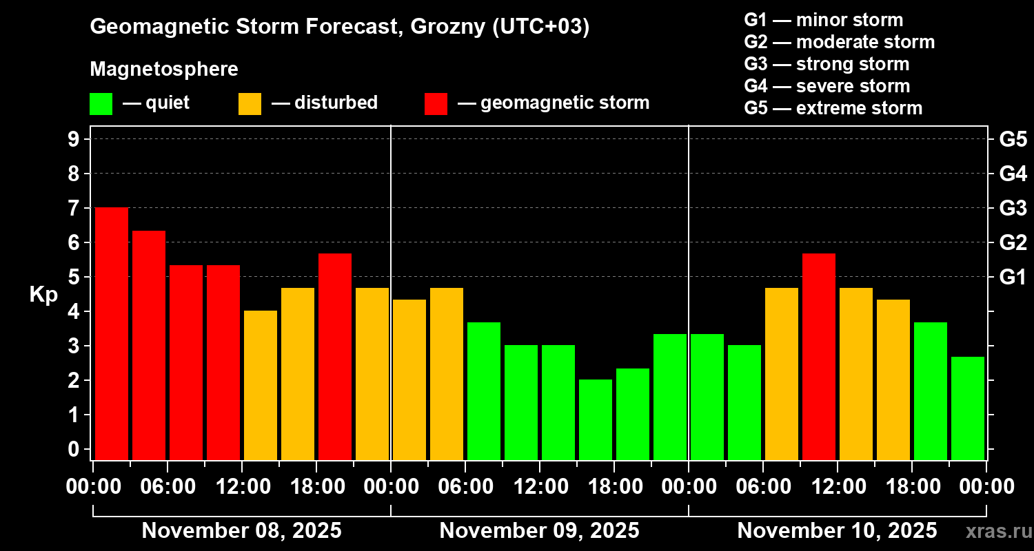 Geomagnetic storm forecast in Grozny for Nov 08, 2025