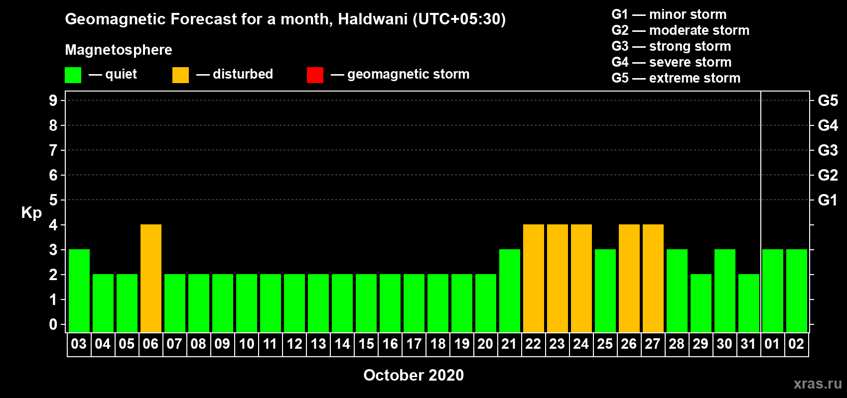 Geomagnetic storm forecast in Haldwani for Oct 03, 2020